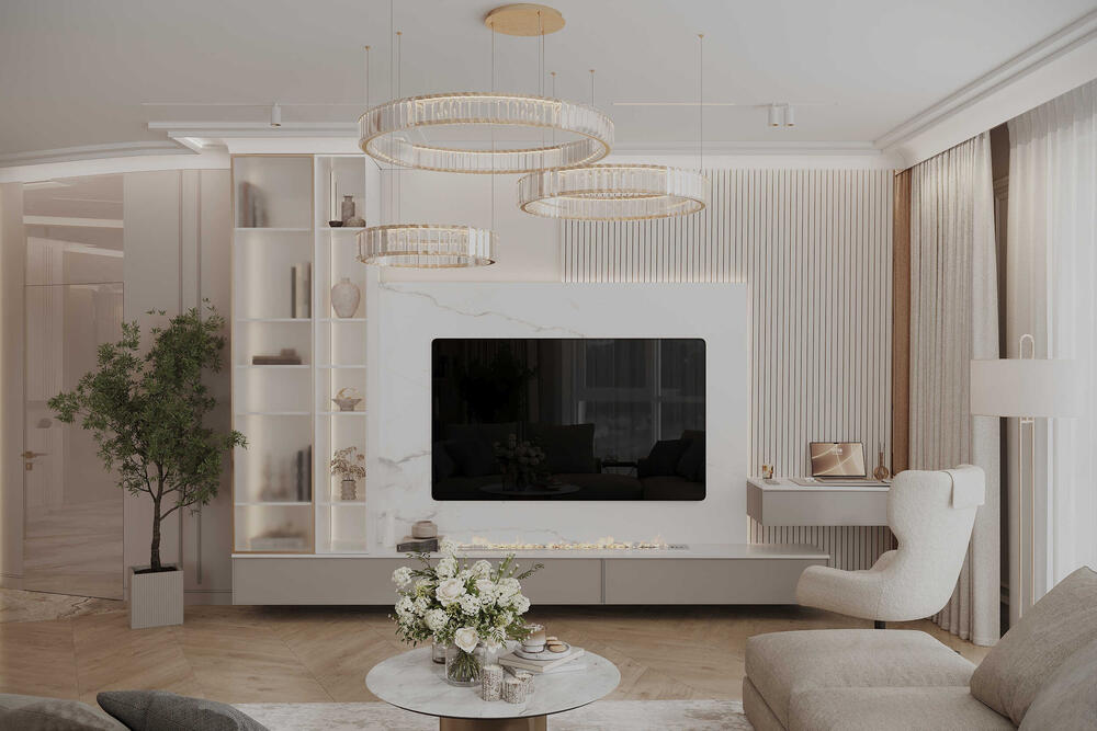 Двухуровневые потолки с радиусными линиями и подсветкой — не только декоративный приём, но и способ зонировать пространство. Благодаря разным сценариям освещения интерьер легко подстраивается под нужное настроение — от мягкого рассеянного света до акцентного.