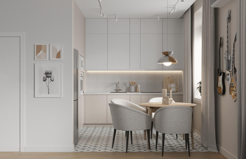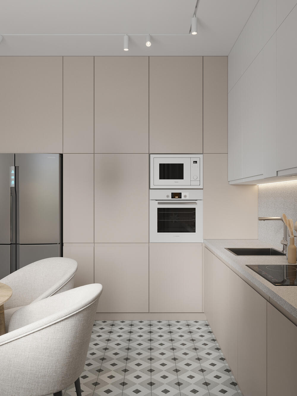 Кухня в этой квартире получилась светлой и удобной. Мы сделали угловую планировку — так и места для хранения хватает, и всё под рукой. Шкафы до потолка аккуратно прячут всю технику и посуду, а фасады без ручек смотрятся легко и современно. Рабочую зону выделили плиткой с графичным узором — она не только защищает пол, но и красиво отделяет кухню от остальной части квартиры. У окна разместили обеденный стол — здесь приятно завтракать при дневном свете или собираться вечером всей компанией.