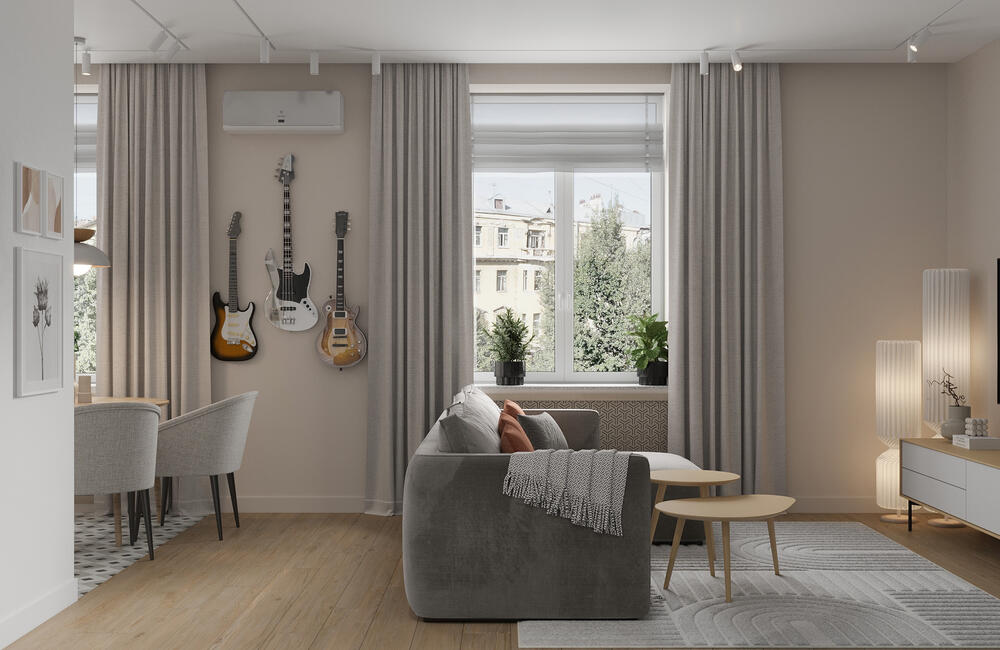 Заказчики хотели, чтобы гостиная была частью общего пространства, но при этом оставалась самостоятельной зоной для отдыха. Мы объединили её с кухней, но выделили с помощью мягкой мебели и расстановки света. Центральное место занимает диван, ориентированный на ТВ-зону, а на боковой стене расположили коллекцию гитар — важную деталь, отражающую увлечения хозяина. Большие окна без тюля наполняют помещение светом, а римские шторы и портьеры добавляют мягкости и завершенности.