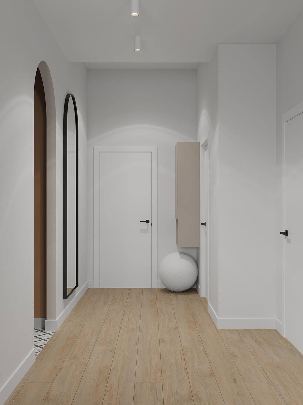 Прихожая получилась компактной, но очень удобной. Здесь есть высокий шкафчик для мелочей и открытая полка, куда можно поставить бутылку с водой или гантели — удобно перед тренировкой или прогулкой. Рядом большое зеркало в тонкой чёрной раме, в котором можно быстро проверить свой вид перед выходом. На полу плитка в зоне входа плавно переходит в тёплое деревянное покрытие, а светлые стены делают пространство более просторным и светлым. Всё просто, аккуратно и без лишнего нагромождения.