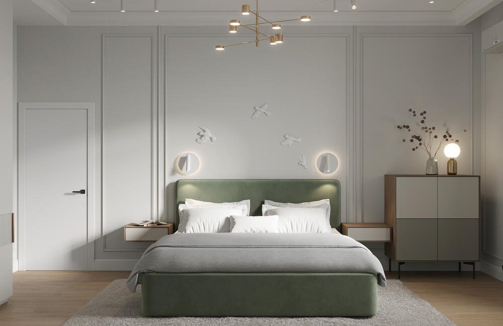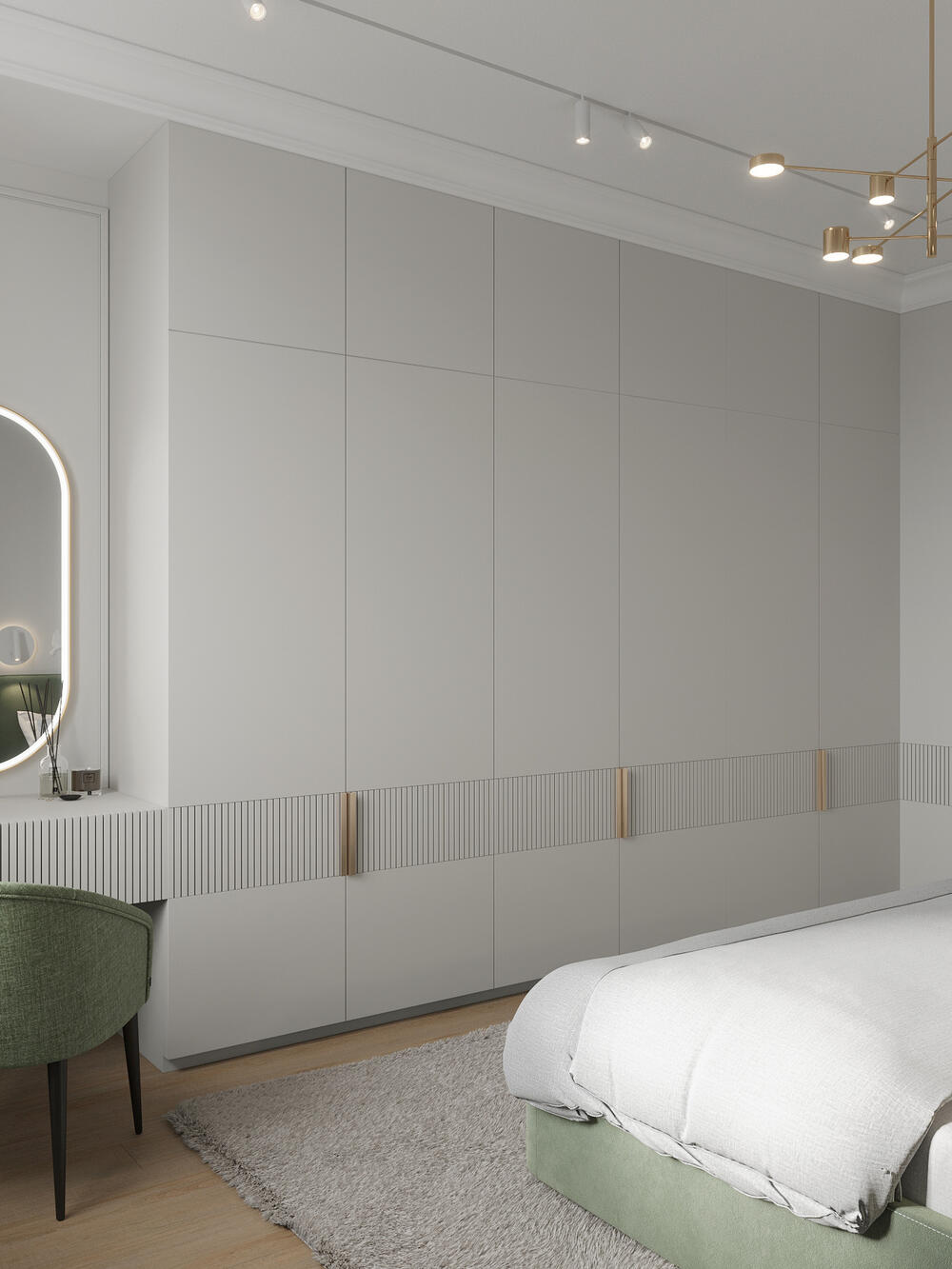 Спальня оформлена в спокойных светлых тонах, чтобы создать атмосферу отдыха и тишины. В центре — мягкая кровать в зеленой обивке, а вдоль стены мы спроектировали вместительную систему хранения с высокими шкафами до потолка. Фасады сделаны без лишнего декора, но с аккуратными рифлёными вставками и тёплыми латунными ручками — так мебель выглядит лёгкой, а комната остаётся просторной. У окна разместили туалетный столик с зеркалом и удобным креслом, чтобы можно было спокойно заниматься уходом или работать за ноутбуком. Такое решение позволило объединить в одной комнате зону сна, хранения и личного ухода.
