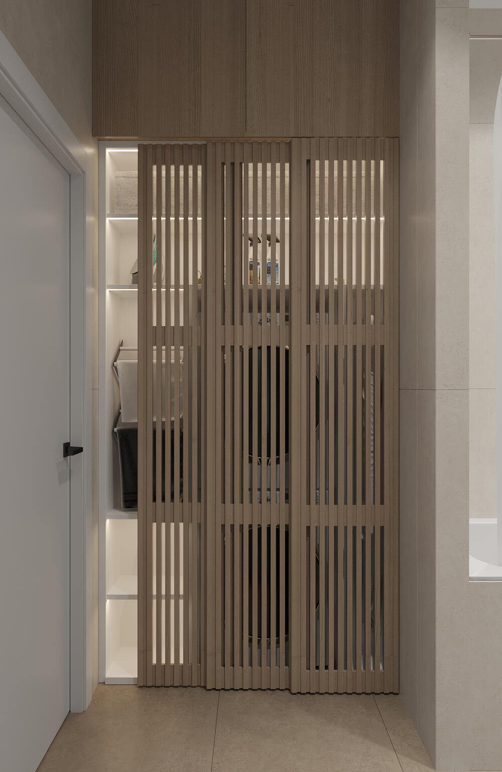 Ванная комната получилась и красивой, и очень удобной. Здесь есть полноценная ванна, в которой можно полежать после долгого дня, и подвесная тумба с раковиной, где всё нужное всегда под рукой. За аккуратными фасадами спрятаны стиральная и сушильная машины, полки для бытовой химии и корзины для белья — так ничего не мешает и не захламляет пространство. Светлая плитка делает комнату более просторной и добавляет ощущение чистоты. Это место, где можно быстро собраться утром или устроить себе спокойный вечер с тёплой ванной.