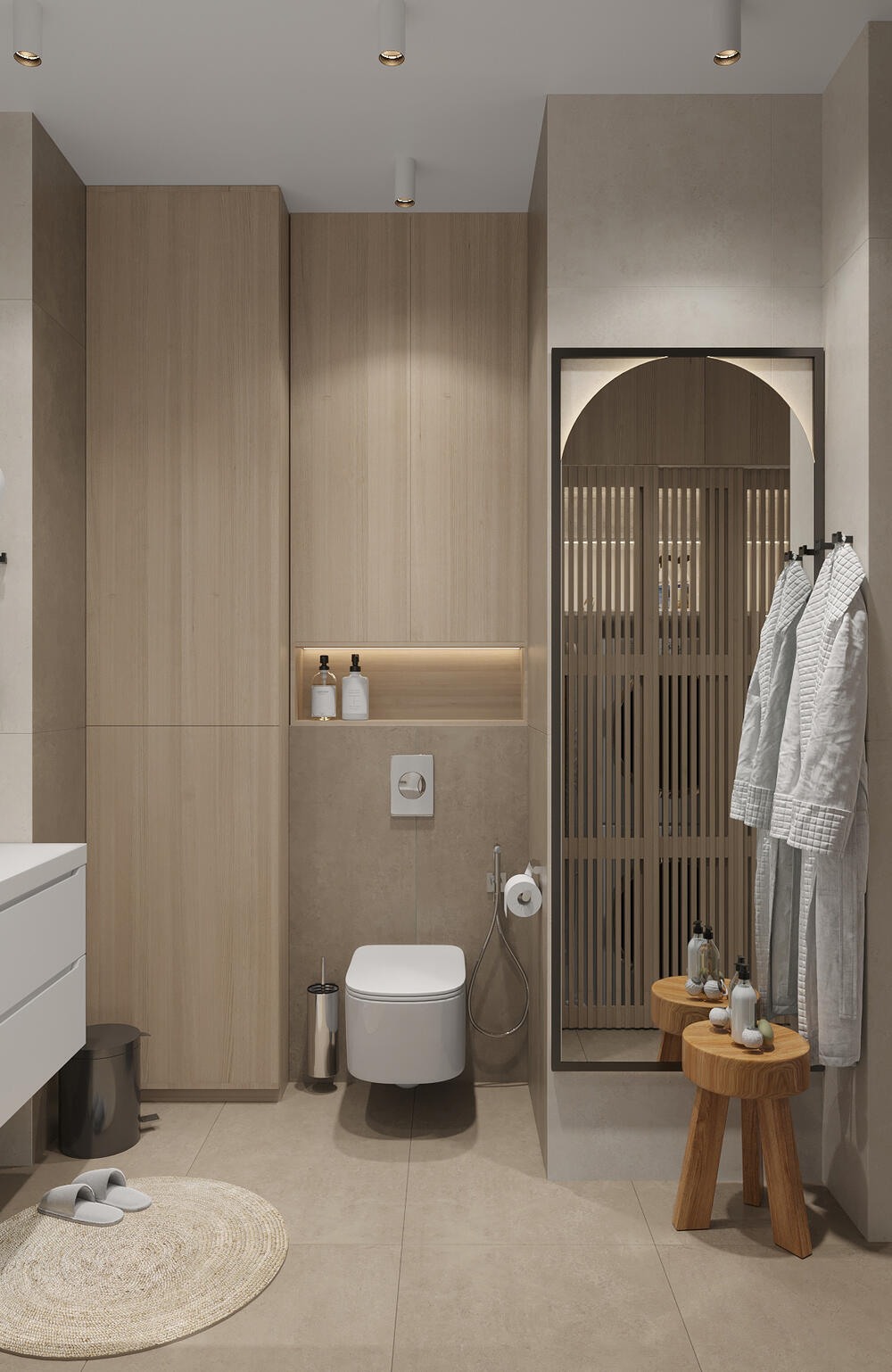 Важным запросом было сделать гостевой санузел полностью автономным. Мы организовали его рядом с входом в зону гостиной, что удобно для гостей и позволяет не нарушать приватность личных помещений. Компактная планировка включает умывальник и унитаз, а отделка в светлых тонах создает ощущение простора.