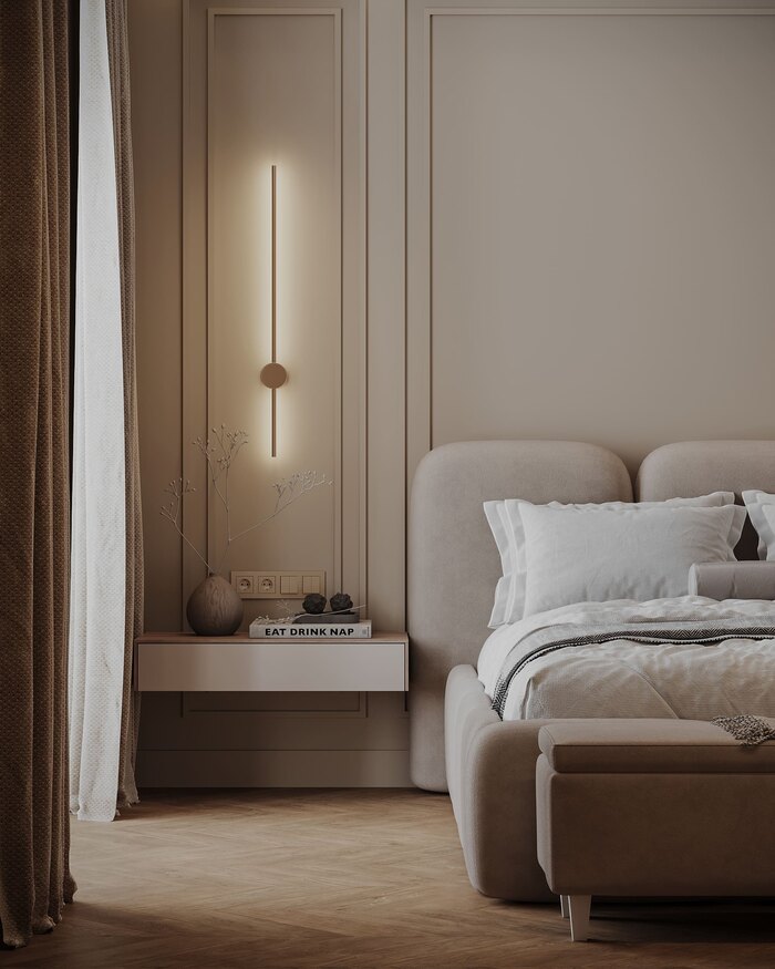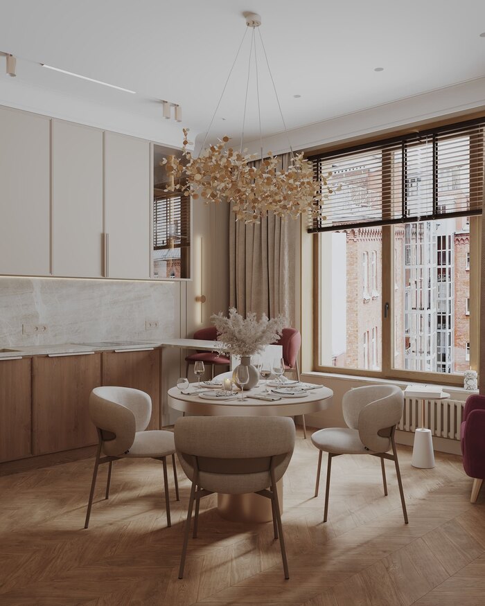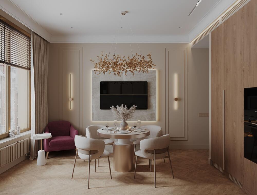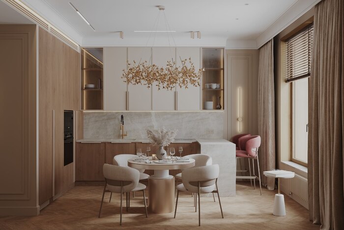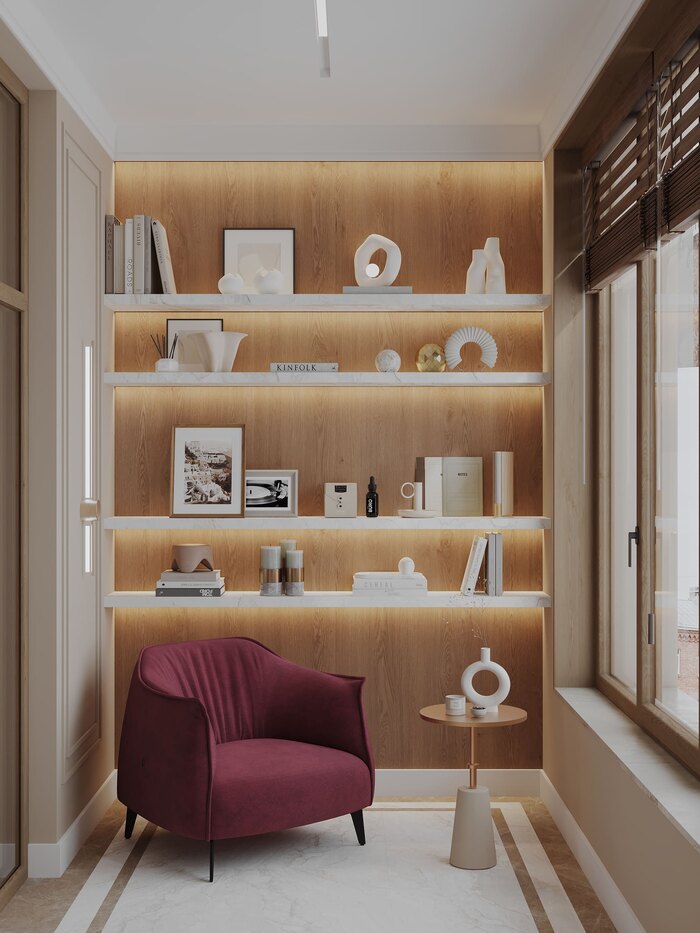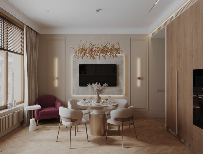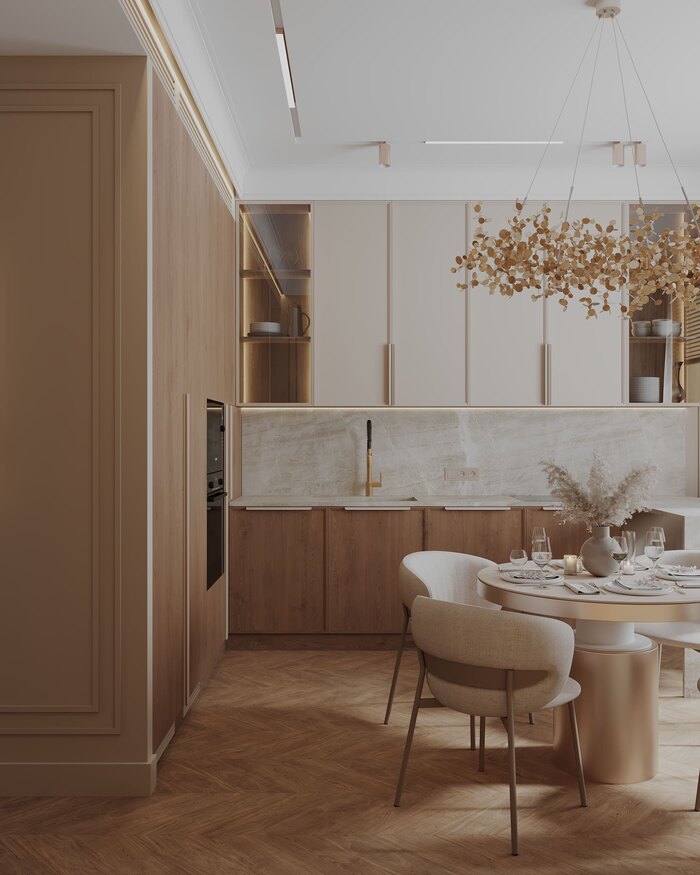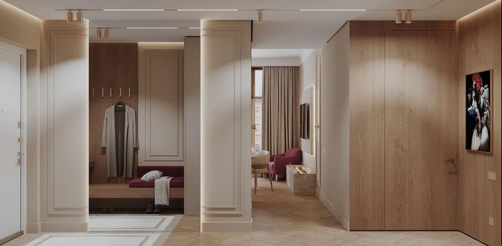 Интерьер выдержан в стиле современной неоклассики с акцентом на материал и свет. В основе — тёплая гамма: бежевые, пудровые и древесные оттенки. Светлый шпон и мягкий текстиль задают атмосферу, винные акценты точечно выделяют ключевые элементы.