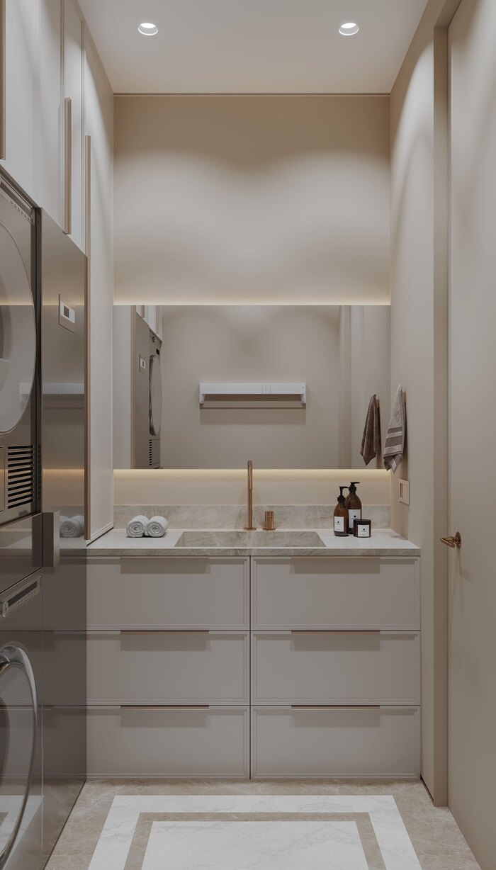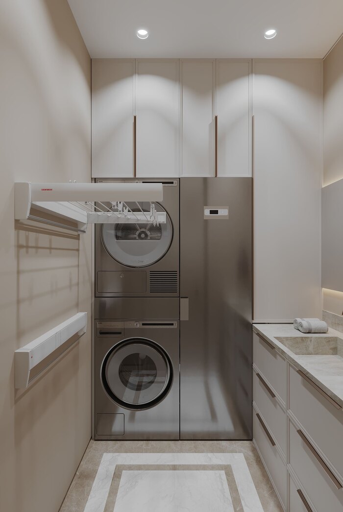На месте бывшего гостевого санузла организован полноценный хозблок. Стиральная и сушильная машины, системы хранения для всего необходимого — от бытовой химии до гладильной доски. Коммуникации скрыты, доступ — изолирован от жилых зон. Решение позволило исключить утилитарные предметы из остального пространства.