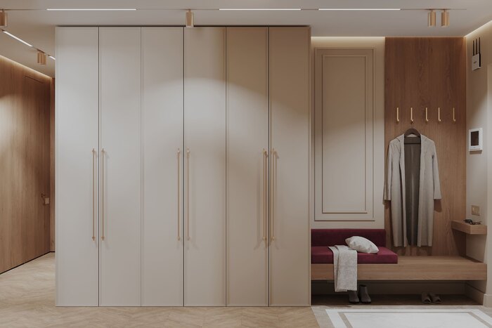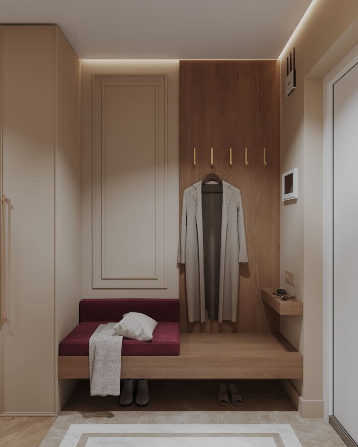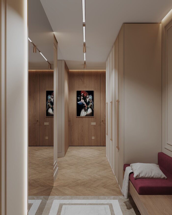 Встроенный шкаф с фасадами под шпон стал ядром зоны входа: в нём спрятаны все щитки и бытовые мелочи. Напротив — мягкое сиденье насыщенного винного оттенка, зеркало, декоративные панели. Линия теневого профиля с подсветкой ведёт вглубь квартиры, подчёркивая геометрию.