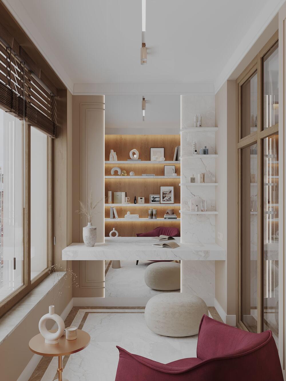 Балкон перестал быть просто выносом за периметр — его превратили в личную зону хозяйки. Здесь можно собраться перед выходом, сделать макияж, почитать или просто уединиться. Столик с подсветкой, полки для аксессуаров и ниша под любимые мелочи — пространство подстроено под ритуалы.