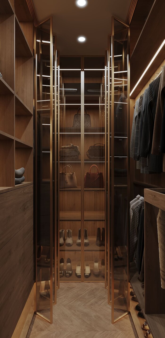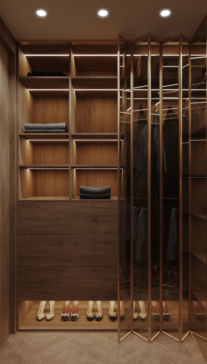 Гардеробной здесь не просто предусмотрено место — её статус заявлен. Кладовую трансформировали в зону хранения с закрытыми секциями, выдвижными ящиками и полками под аксессуары. Несмотря на скромную площадь, пространство организовано с прицелом на эргономику.