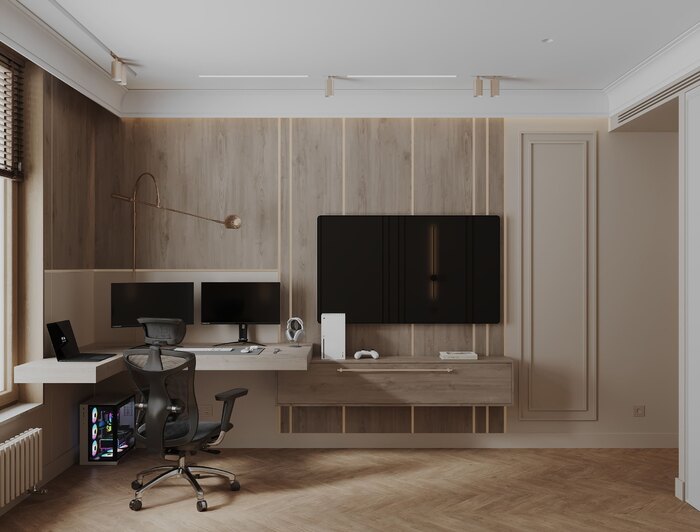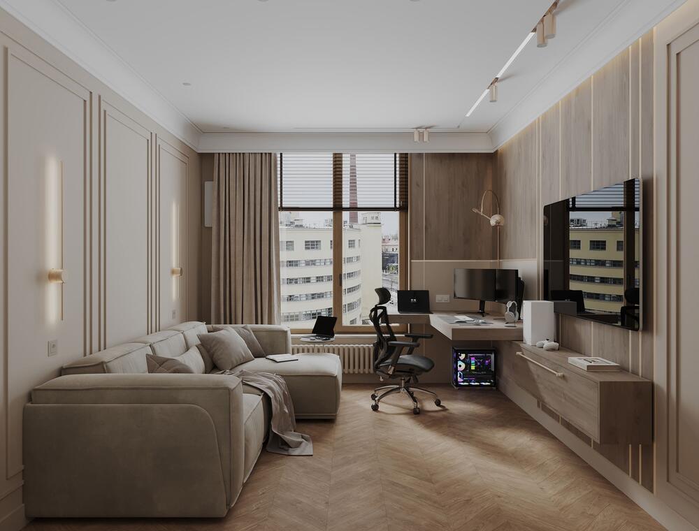 Вдоль окна — стол с монитором, розетками и креслом. По центру — диван и ТВ-панель с мягкой подсветкой. Оттенки — тёплые, обволакивающие. Мебель — лаконичная, но с характером. Пространство не просто универсальное, а стратегически гибкое.