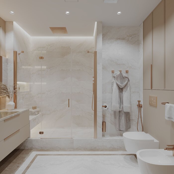 Разместить душ, биде, унитаз и широкую раковину в одном санузле