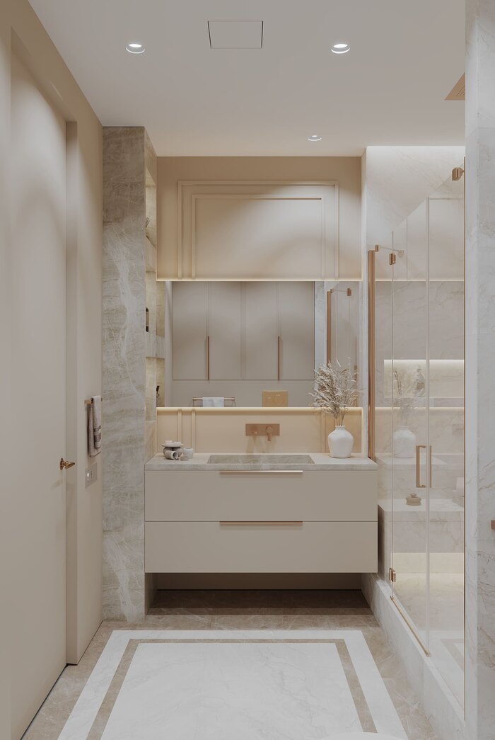 Отделка — керамогранит крупного формата, минимум швов, максимум визуальной чистоты. Получилось строго, практично и в точности по брифу.