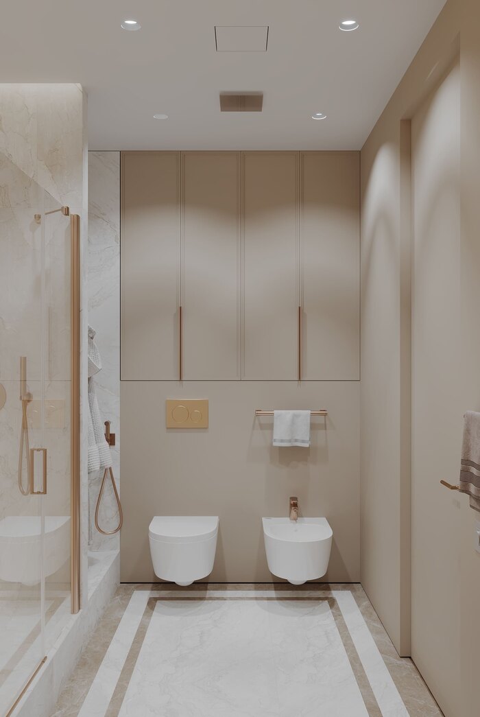 Исходная структура квартиры была стандартной: узкий коридор, квадратная кухня, кладовая и два санузла. Мы пересобрали пространство под конкретный образ жизни. Основной санузел расширили на 15 см за счёт коридора — этого оказалось достаточно, чтобы разместить душевую, биде и полноценную тумбу. Гостевой санузел заменили на хозяйственный блок — теперь у семьи есть техническая зона вне жилых помещений.