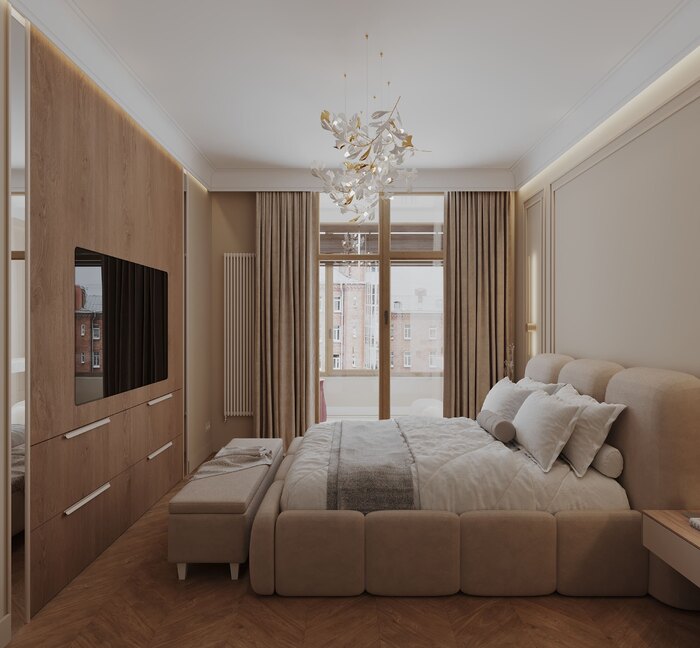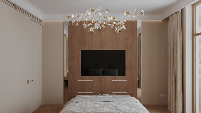 Несущая колонна, которую обычно прячут, здесь стала частью акцента: мы встроили ее в композицию с мягким изголовьем и архитектурной подсветкой. ТВ подвешен на кронштейн, провода спрятаны, под панелью — скрытые ящики. Спокойная гамма, дерево и текстиль работают на атмосферу уединения.