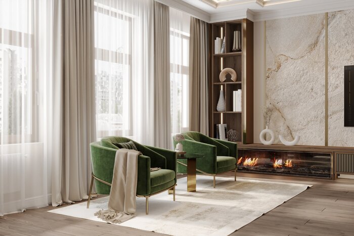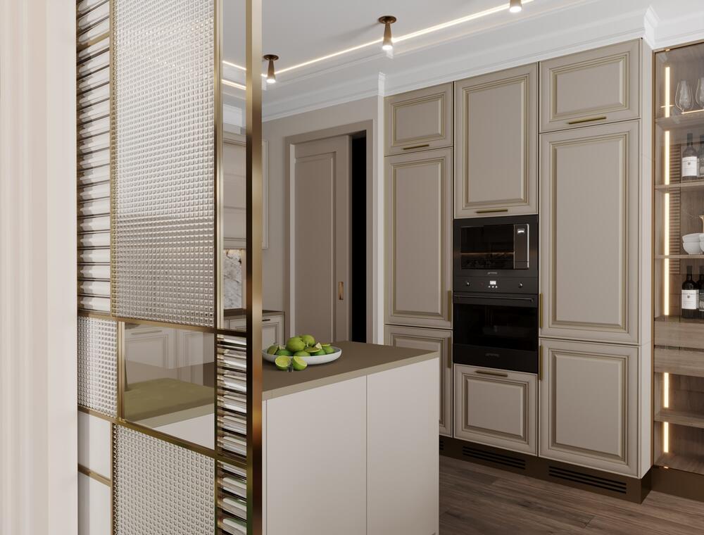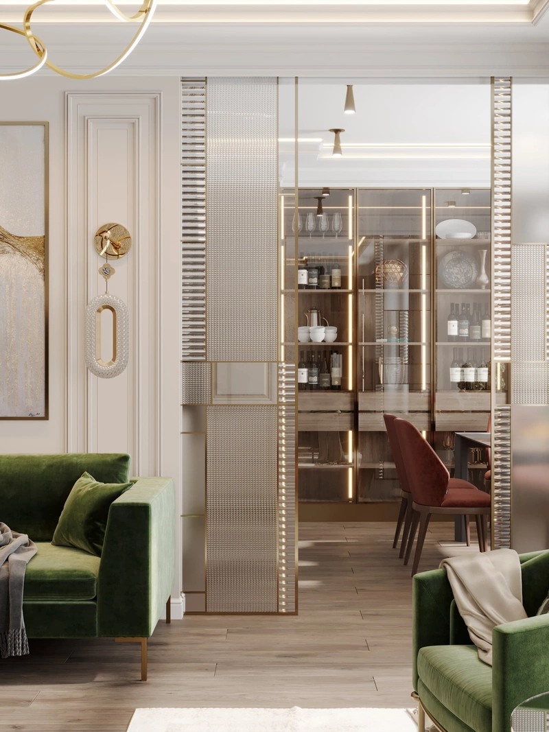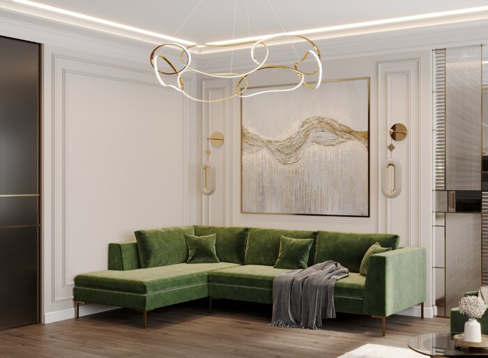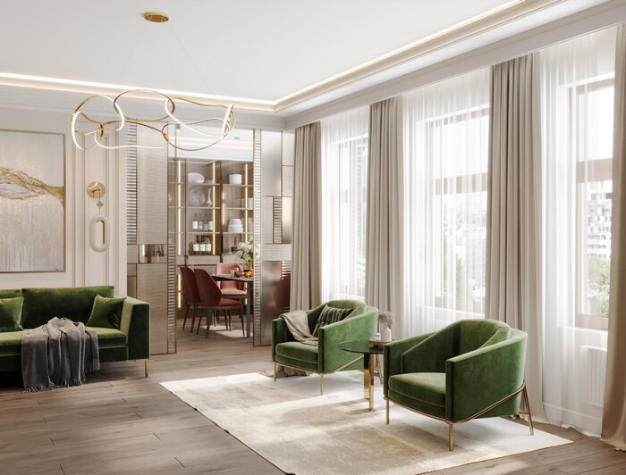 Дизайн интерьера квартиры в стиле современная классика с зелеными акцентами в ЖК «Neva Residence» - 116 м²