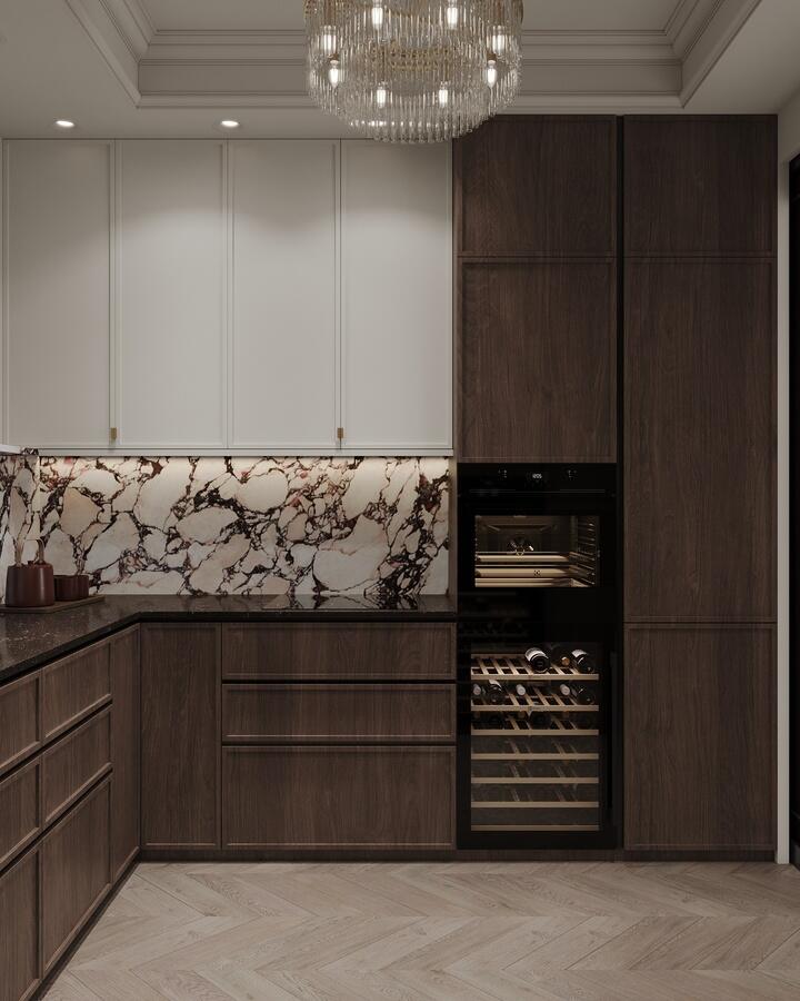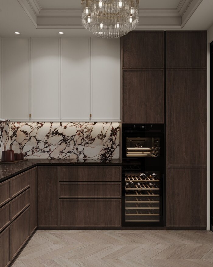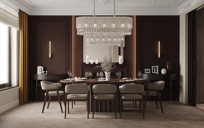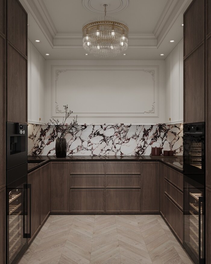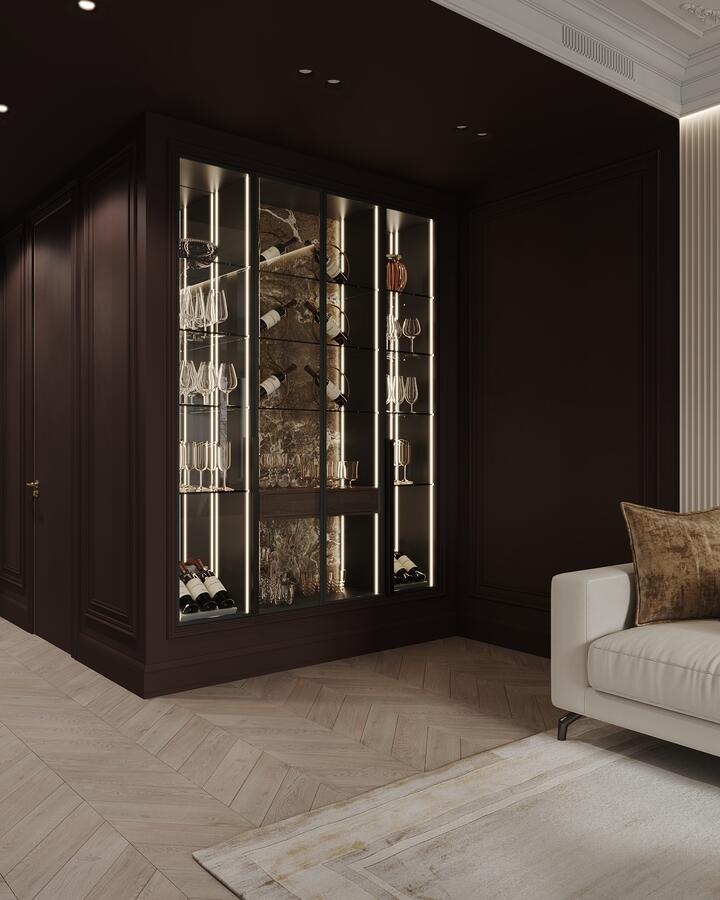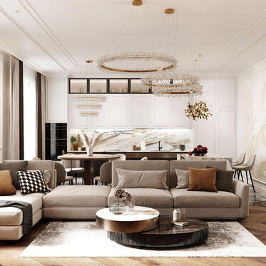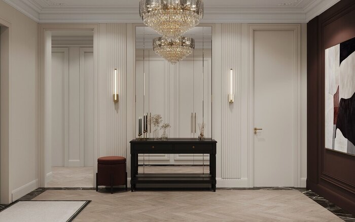 В проекте выбрана неоклассика с современными деталями — стиль, который подчёркивает статус квартиры и в то же время остаётся практичным для жизни.