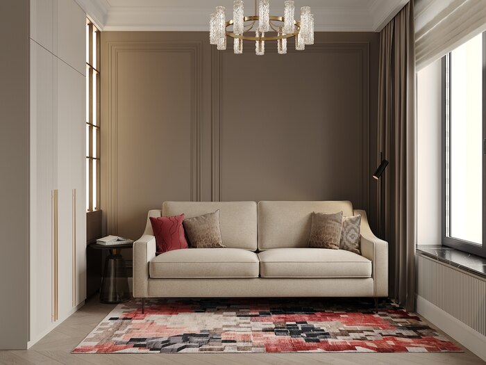 Функциональность дополнена элегантным оформлением: светлая мебель, тёмные акценты и ковёр с ярким геометрическим рисунком создают живую атмосферу. Хрустальная люстра и текстильные шторы делают комнату по-настоящему гостеприимной.