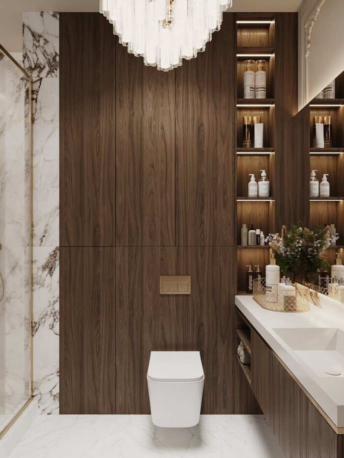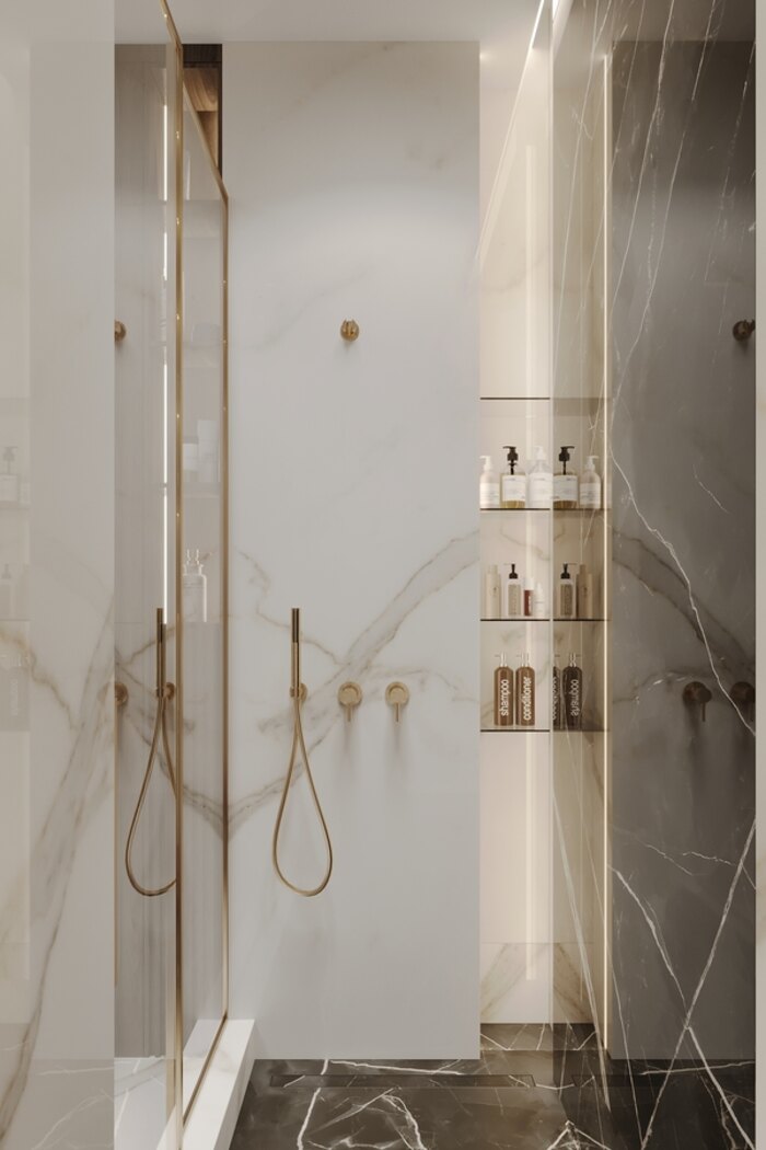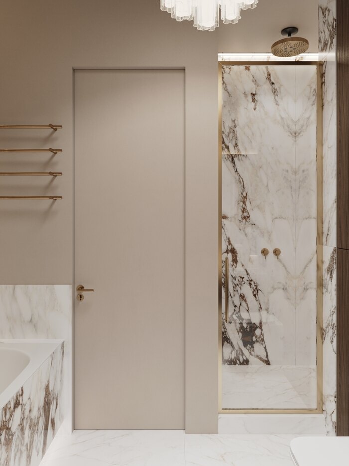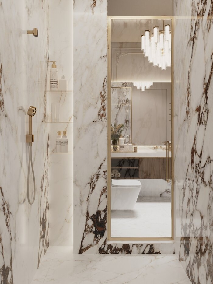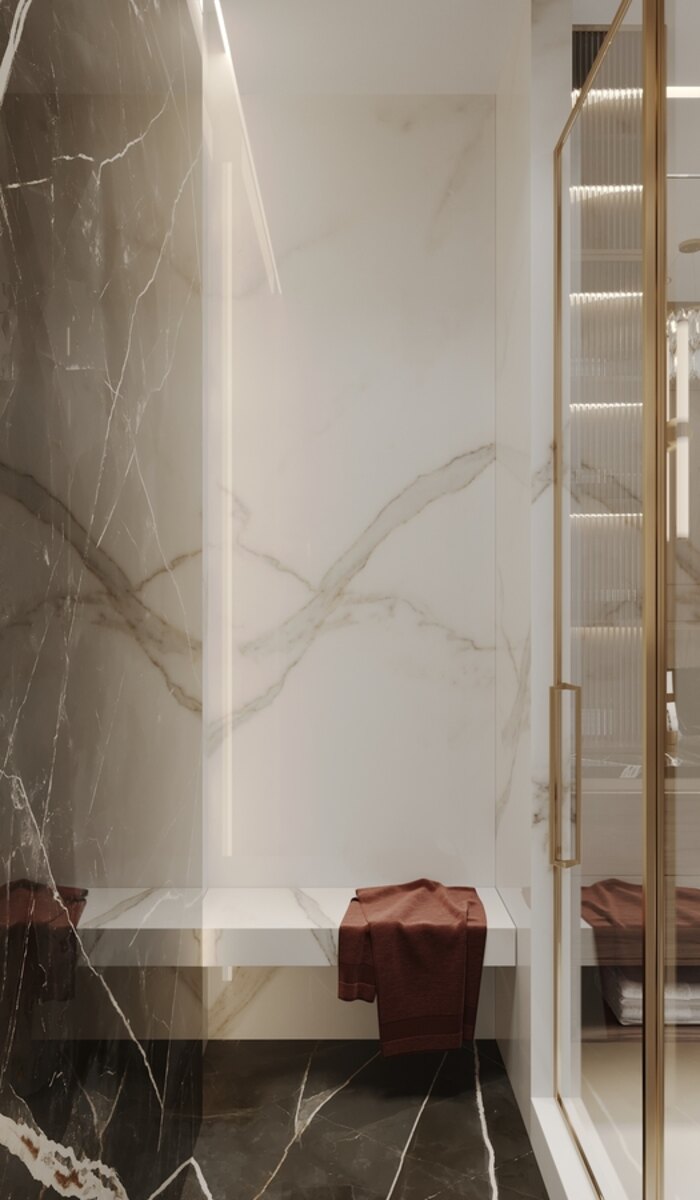 В отделке использован керамогранит под мрамор: он долговечный, практичный и визуально расширяет пространство. Тёплые акценты и светлые оттенки создают ощущение лёгкости, а встроенные системы хранения помогают держать всё необходимое под рукой, не перегружая интерьер.
