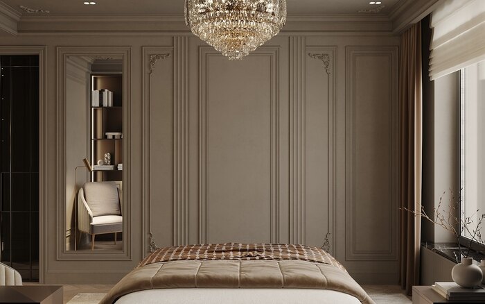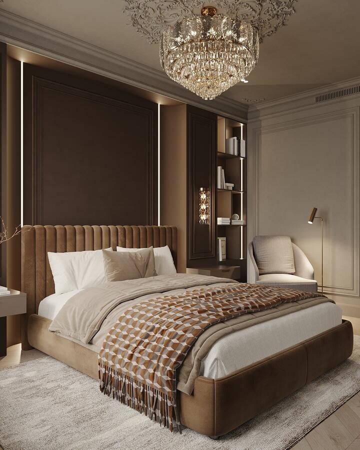 В отделке спальни мы использовали глубокие оттенки и сложные фактуры. Изголовье кровати подчеркнуто декоративными панелями и мягкой подсветкой, создающей камерную атмосферу. Текстиль и ковёр добавляют тактильности, а люстра в классической форме завершает образ парадной, но при этом приватной комнаты.