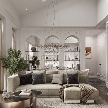 Посмотреть проектДизайн интерьера квартиры в памятнике культурного наследия «Дом Бенуа» в стиле сдержанная классика с элементами ар-деко - 224 м²
