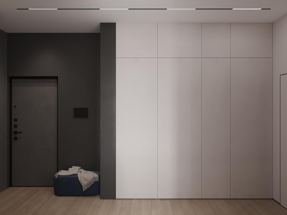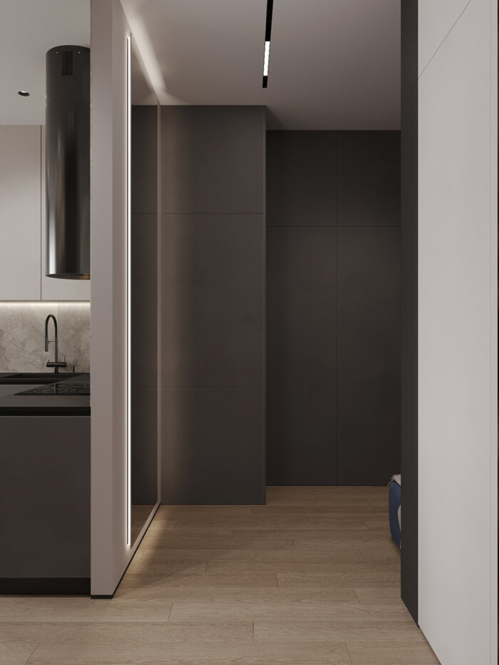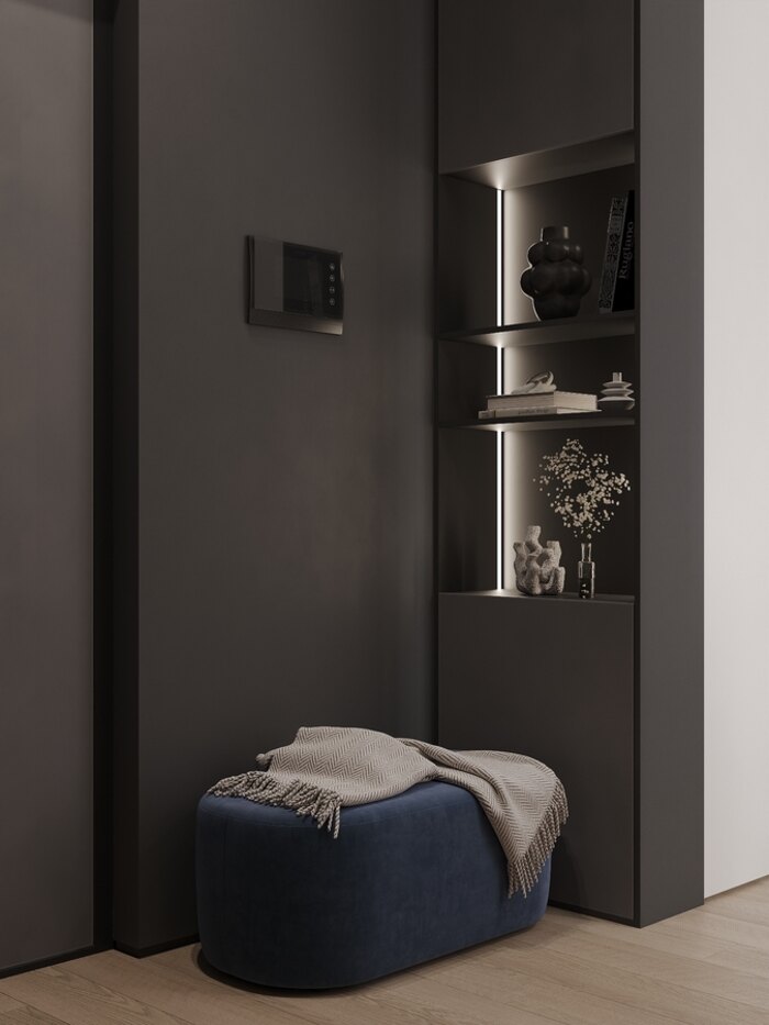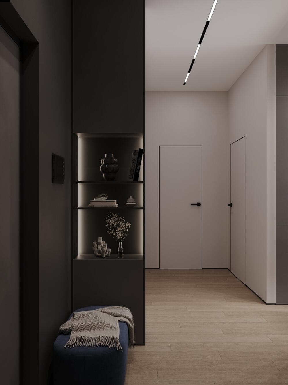 Слева от входа — акцентный тёмный блок с открытыми нишами и мягкой подсветкой. На полках можно разместить декор или хранить вещи, к которым нужен быстрый доступ. Это не только функционально, но и делает прихожую атмосферной, не просто «проходным» пространством.