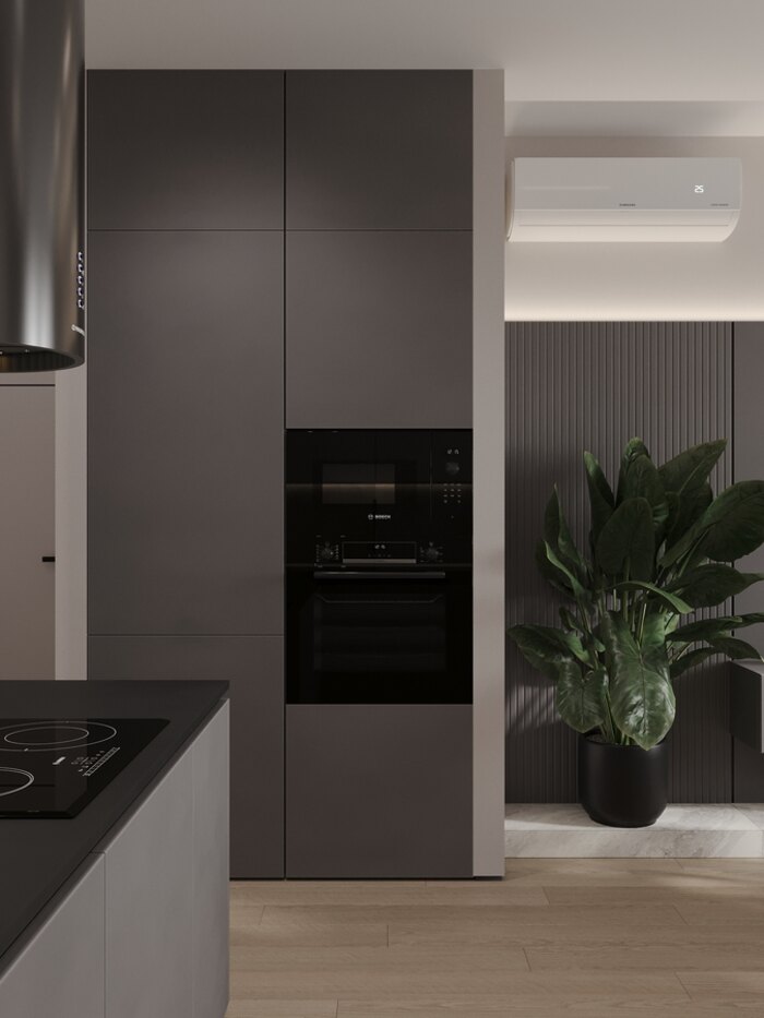 Каждый метр работает на хозяев: встроенная техника освобождает кухню, продуманная система хранения поддерживает порядок, интерьер построен на спокойных оттенках и выверенных линиях.