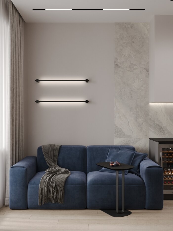 Световые линии на потолке задают направление и визуально вытягивают пространство, создавая ощущение динамики и современности.