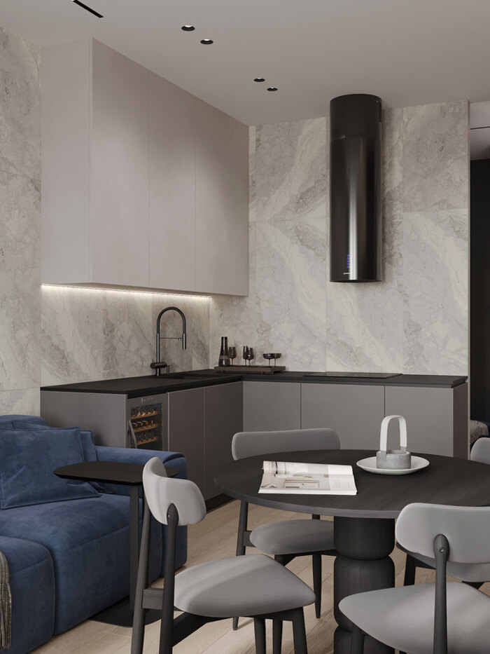 Фартук и стену за варочной зоной оформили крупноформатным керамогранитом под камень — он стал выразительным акцентом и визуально выделил кухню от гостиной. Благодаря такой отделке зона выглядит чисто и лаконично, а уход за ней не требует усилий.