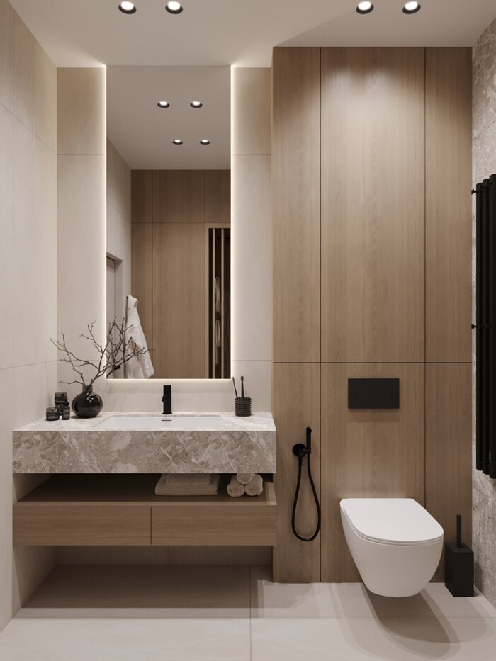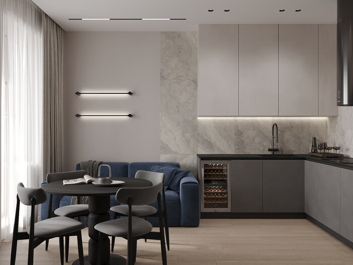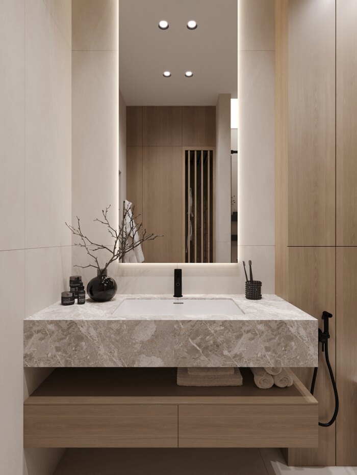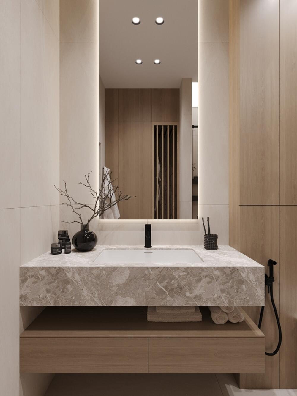 В основе интерьера — современный минимализм, где каждая линия и текстура работают на ощущение порядка и спокойствия.