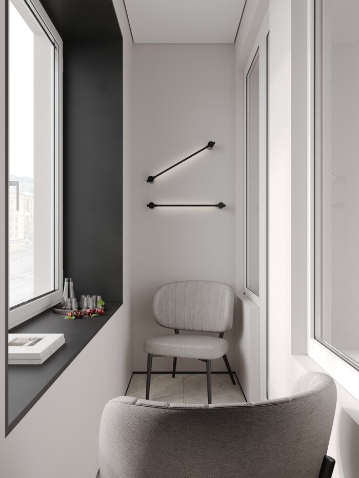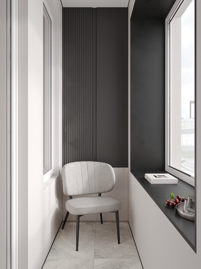 Балкон оформлен как тихая мини-зона для уединения. Здесь нет ничего лишнего — только удобное кресло, тёплый пол и широкая поверхность вдоль окна, на которую можно поставить книгу, ноутбук или чашку кофе.
