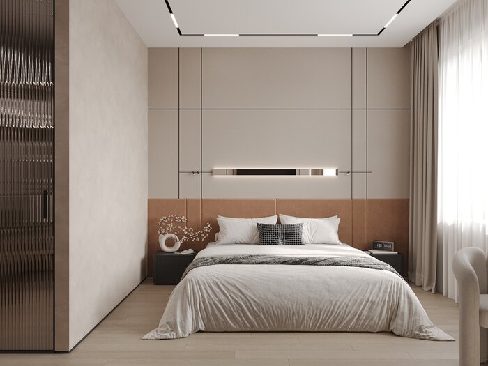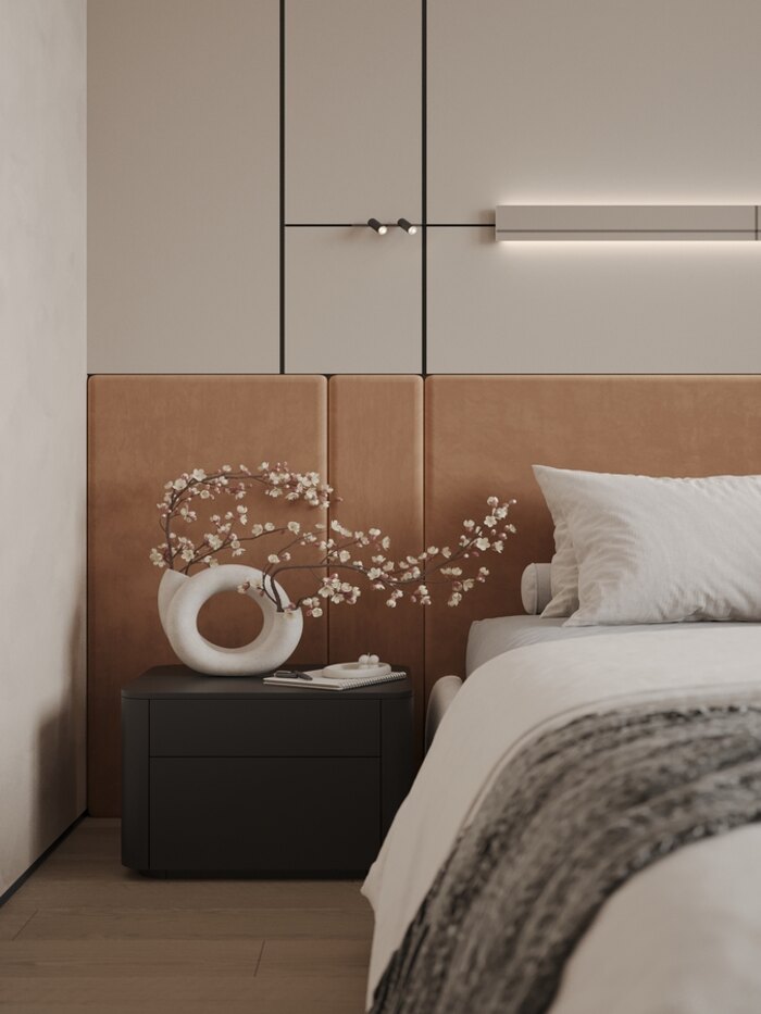 Изголовье встроено в стену — это решение позволило сэкономить место и добавить глубины. На боковых стенах предусмотрены светильники направленного света: их удобно использовать и для чтения, и как мягкий вечерний сценарий.