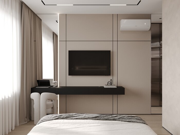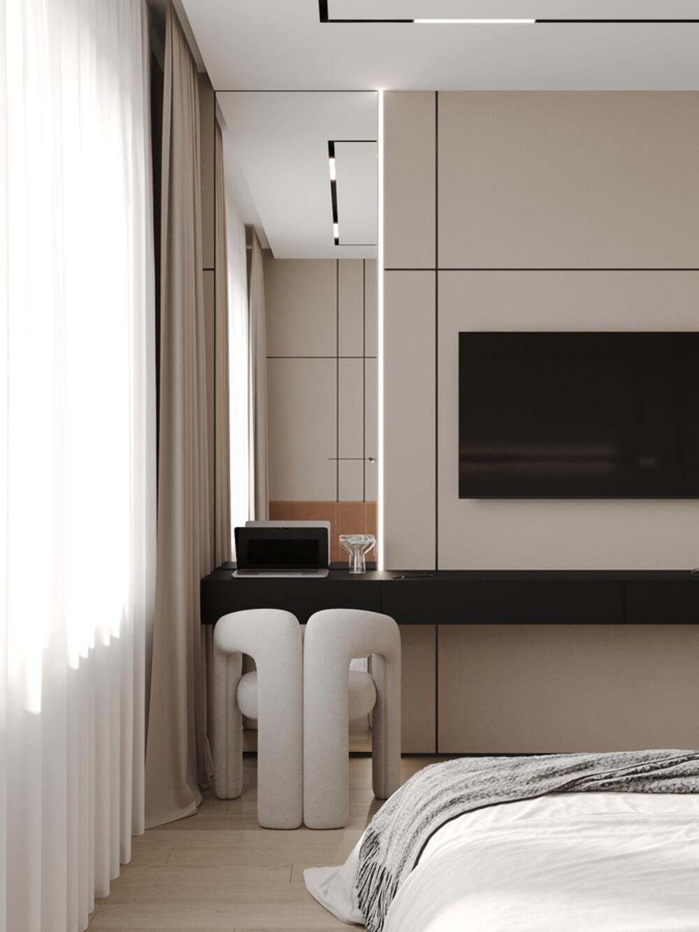 На противоположной стене разместили ТВ и лаконичный туалетный столик, который при необходимости превращается в рабочее место. Его чёрная поверхность контрастирует со светлыми стенами и поддерживает общий минималистичный ритм.