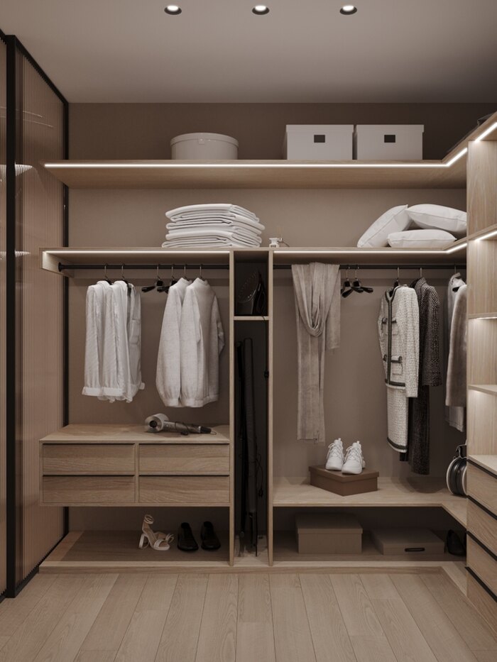 Внутри всё продумано по эргономике: вдоль одной стены — секции для длинной одежды, напротив — выдвижные ящики и открытые полки для повседневных вещей.