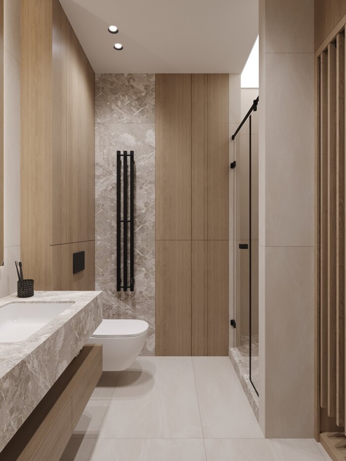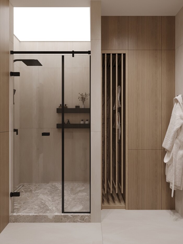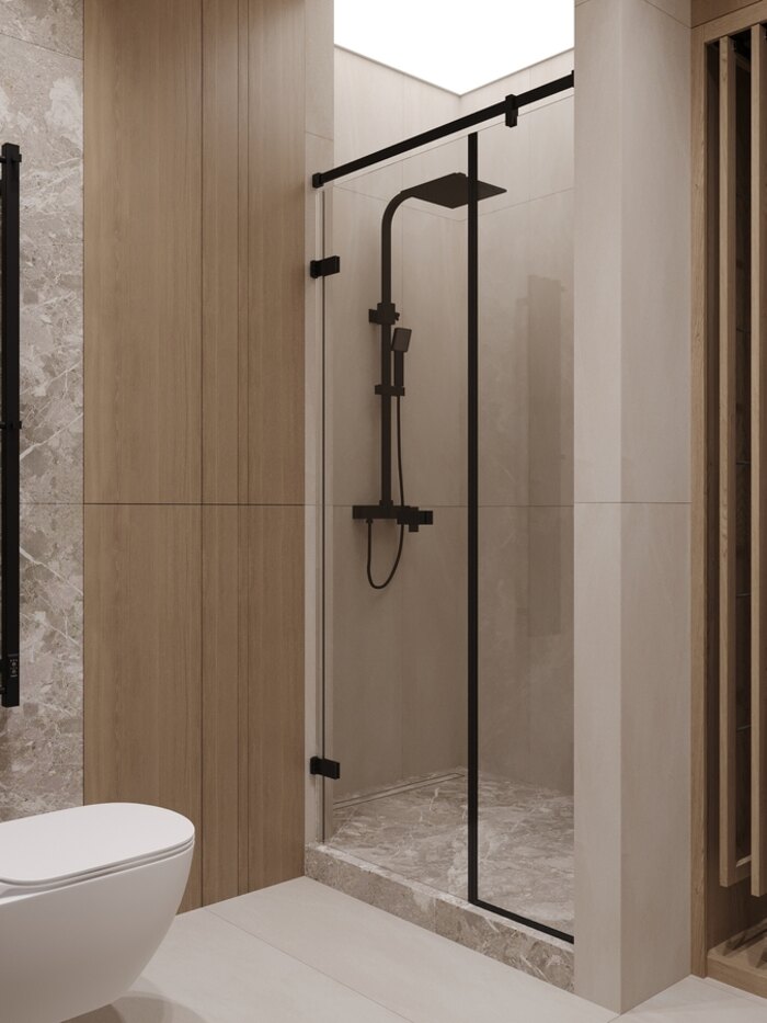 Душевая выделена стеклянной перегородкой с чёрной фурнитурой — она визуально не «съедает» площадь и смотрится современно. Поддон и стены отделаны керамогранитом под камень, благодаря чему зона выглядит монолитно и аккуратно.