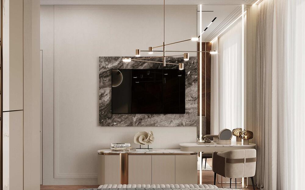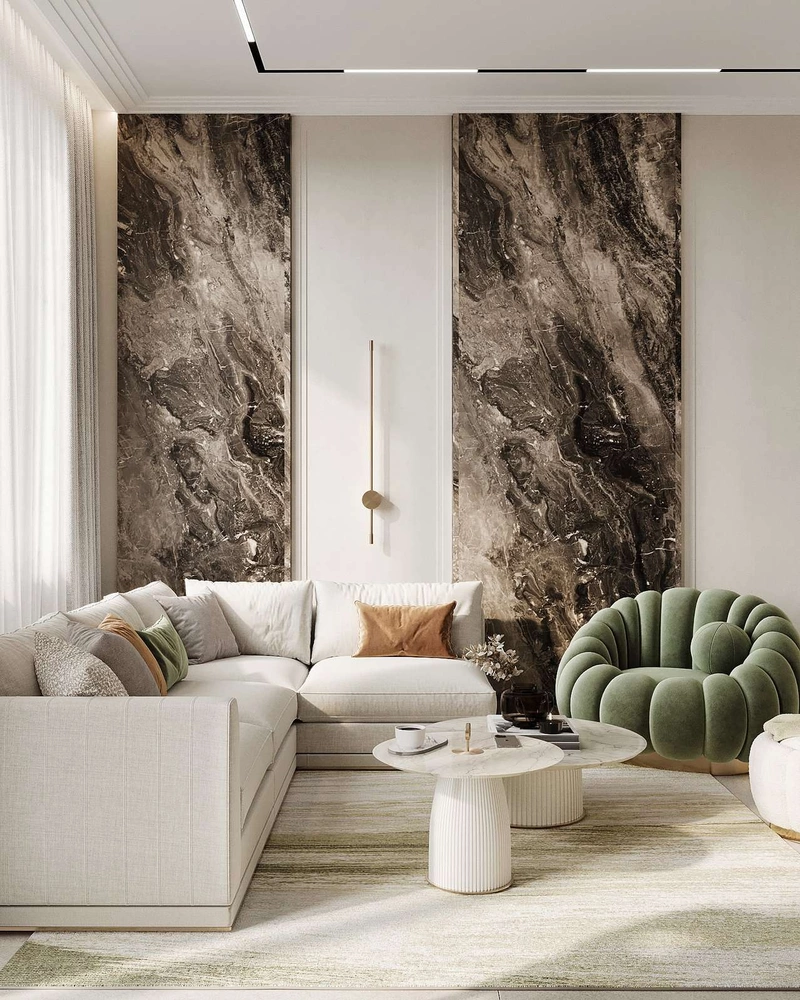 Гостиная оформлена в нейтральных тонах с акцентом на текстуру декоративного керамогранита на стенах. Мягкий диван с акцентными подушками и кресло с бархатной обивкой создают комфортную зону для отдыха. Паровой камин под телевизором стал функциональным элементом, дополняющим стиль комнаты.