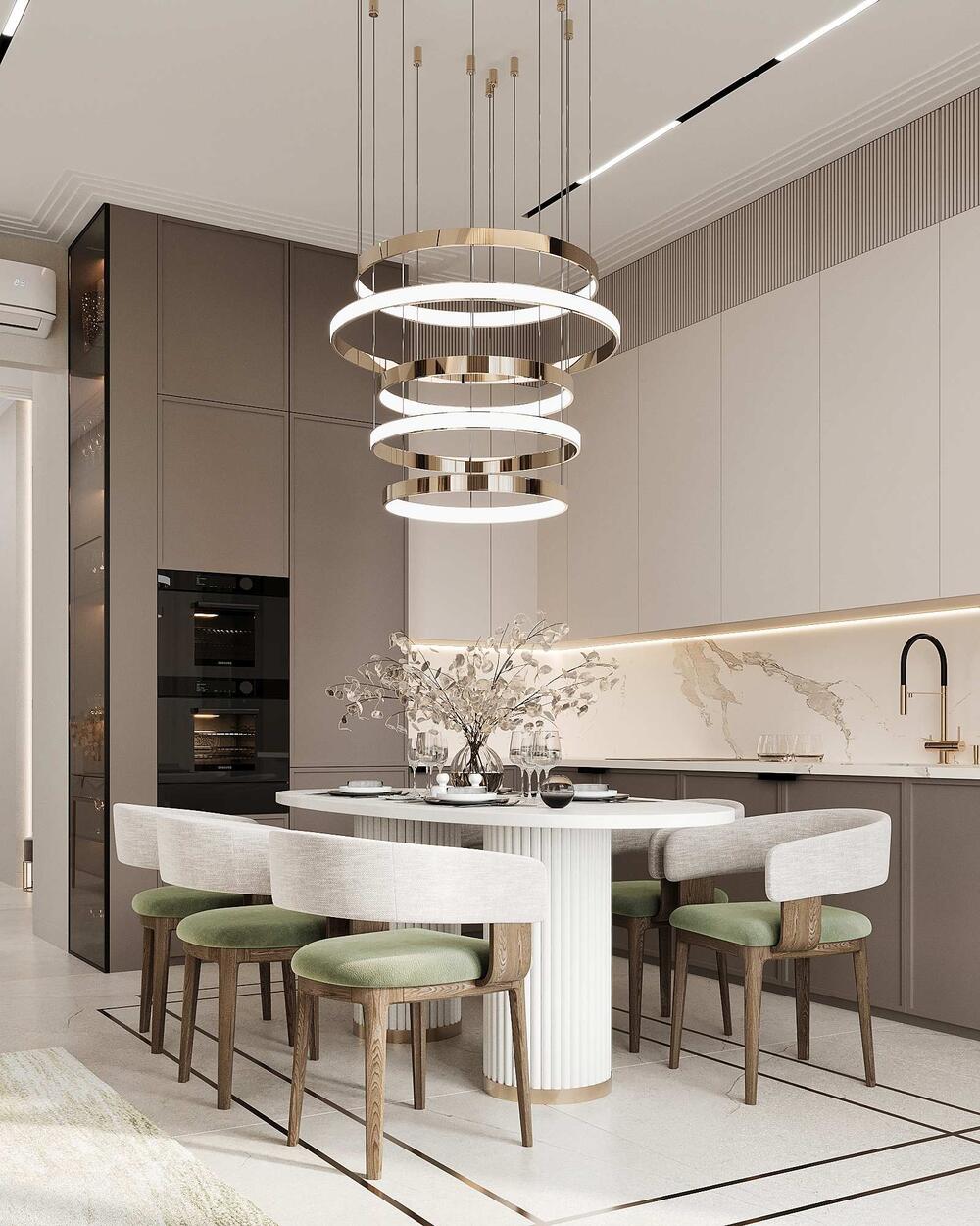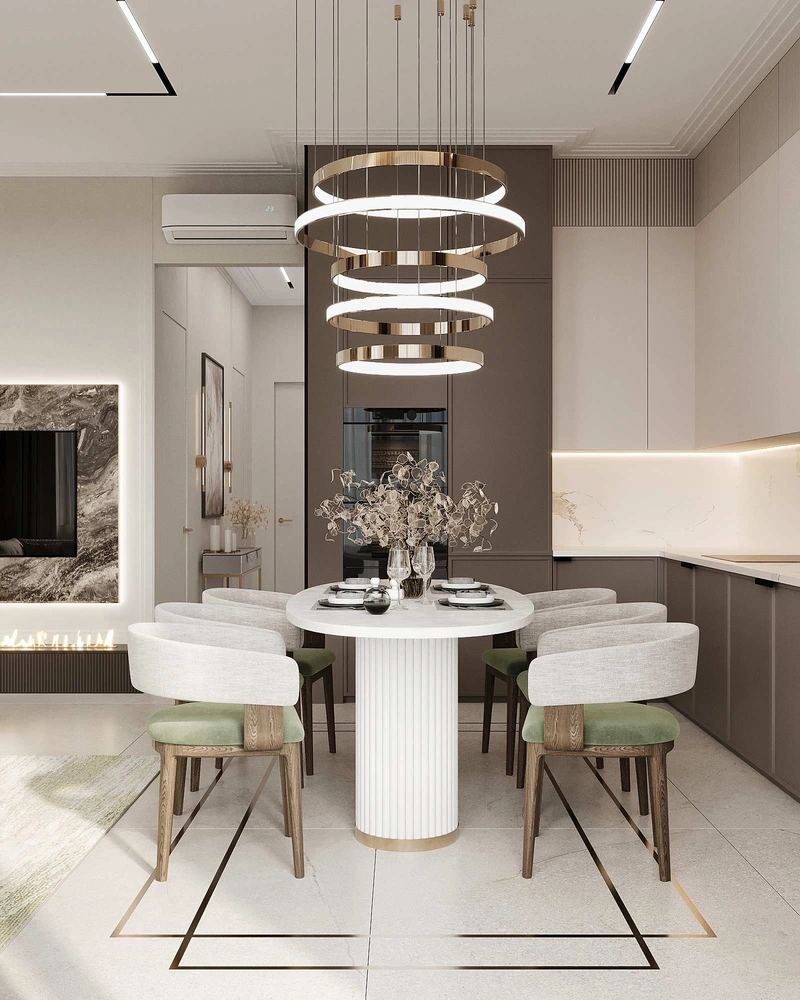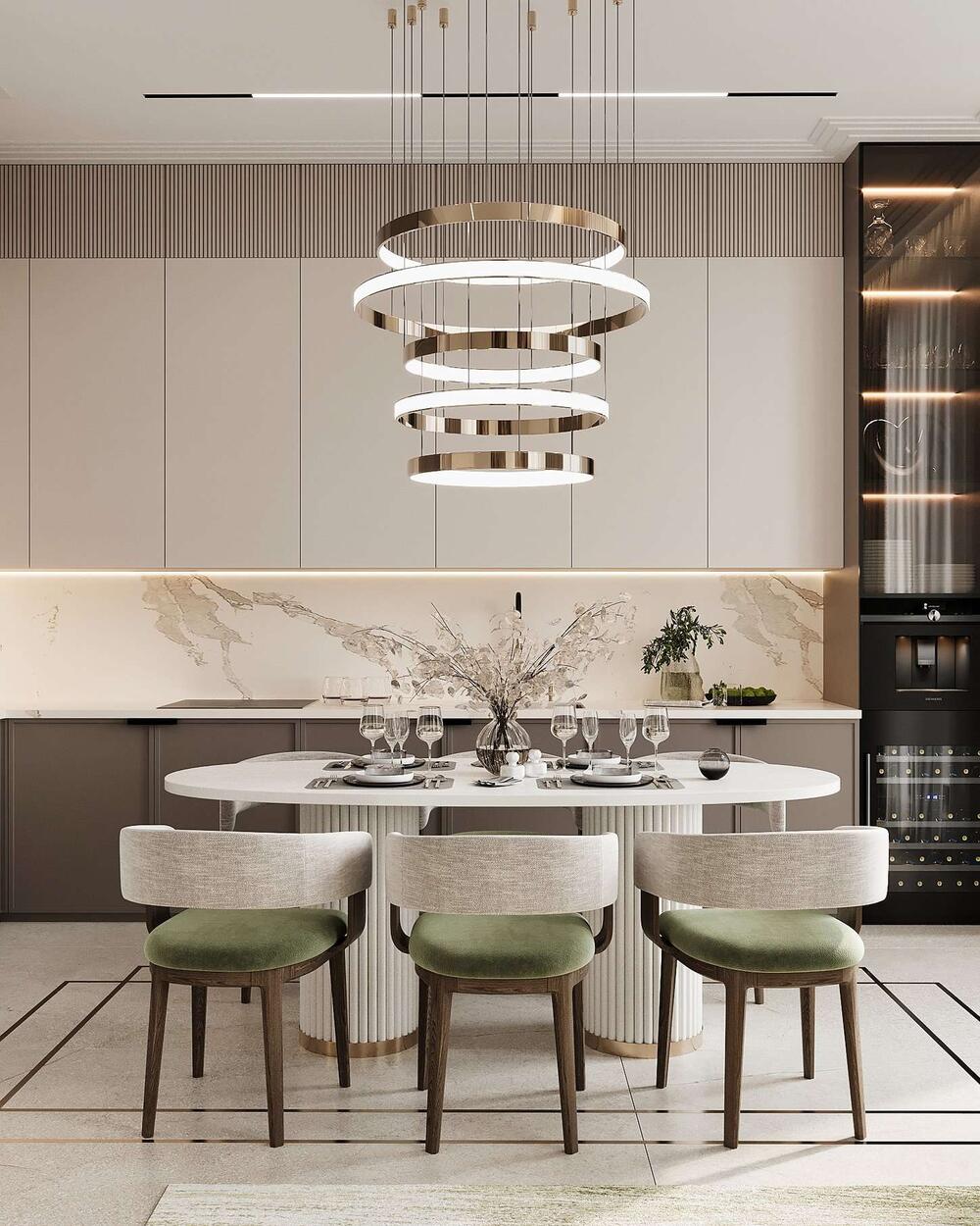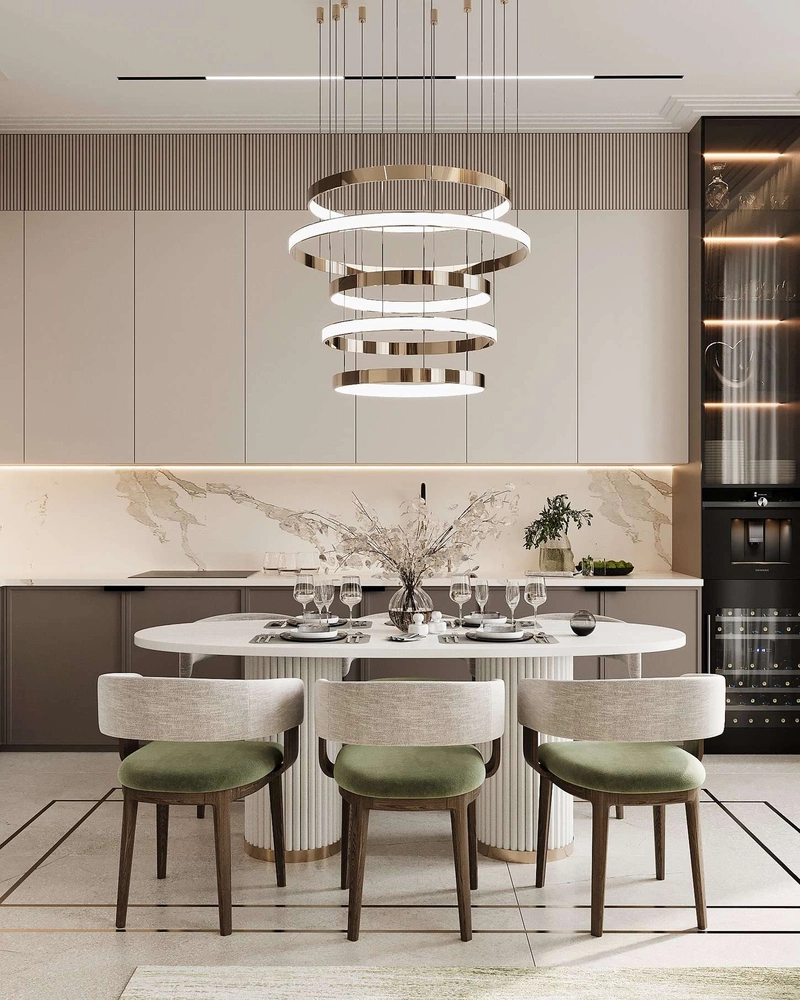 Кухня оформлена в молочных и фисташковых оттенках. Рабочая зона максимально функциональна, оборудована встроенной техникой: духовым шкафом, варочной панелью и посудомоечной машиной. Фартук выполнен из мрамора с выразительным природным рисунком, что добавляет интерьеру глубины. Большой обеденный стол с каменной столешницей и кресла с бархатной обивкой создают уютную зону для семейных обедов.