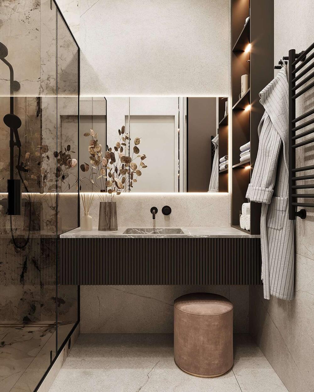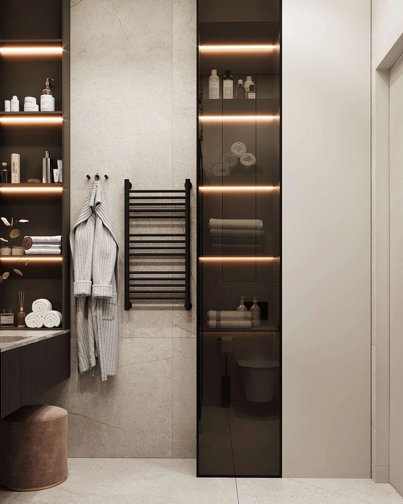 Ванная комната оформлена в теплых бежевых и молочных тонах с использованием натурального мрамора. Душевая ограждена матовой стеклянной перегородкой, встроенные полки с подсветкой позволяют удобно хранить средства ухода. В ванной установлена подвесная тумба с раковиной, выполненной из натурального камня, что подчеркивает изысканность интерьера.