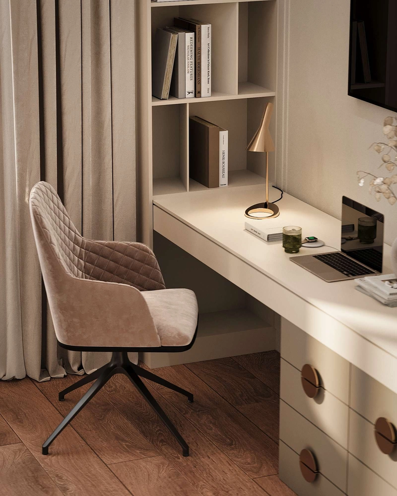 Детская комната выполнена в сдержанных тонах. Оборудована встроенным столом для учебы и системами хранения. Кровать с мягким изголовьем подчеркивает уют и комфорт пространства.