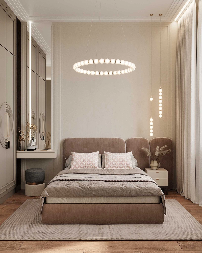 Спальня увеличена за счет объединения с балконом. Центральное место занимает кровать с мягким изголовьем, дополненная текстилем в пастельных тонах. Встроенные шкафы обеспечивают удобное хранение. Гардеробная организована как отдельная зона с эргономичным наполнением.