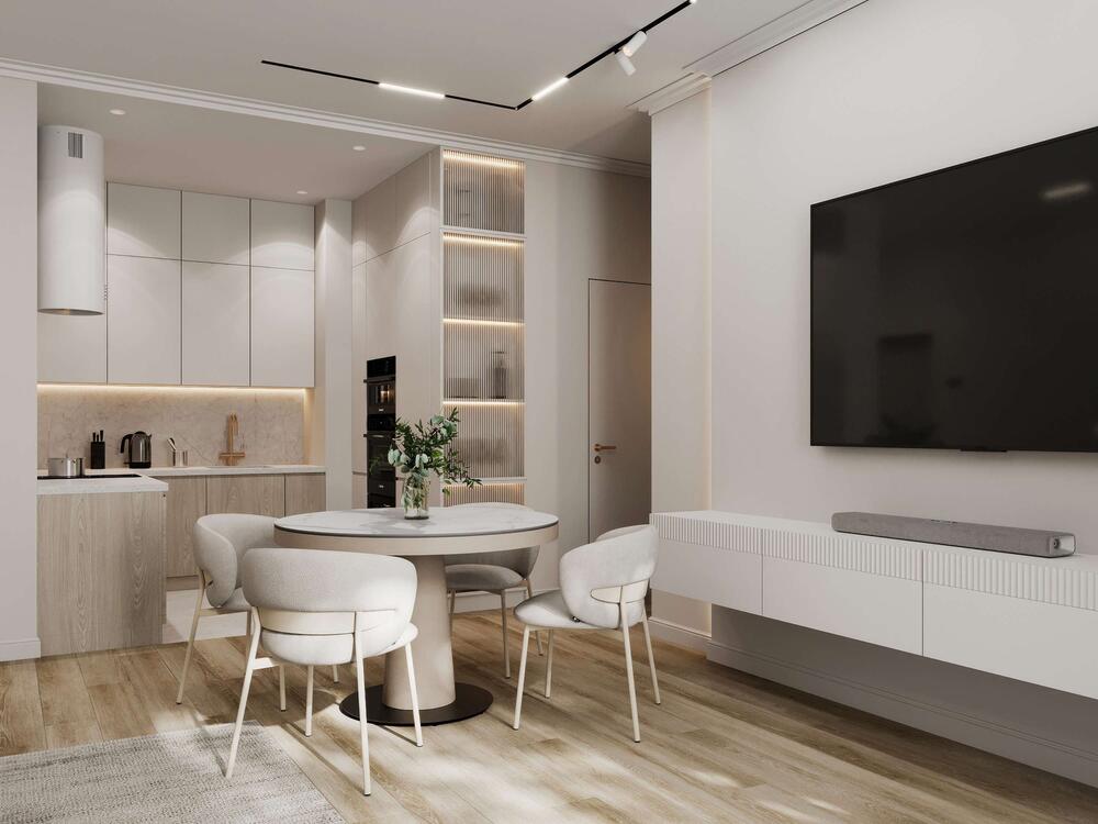 Гостиная — продолжение кухни, объединённое с ней в единое светлое пространство. Зону отдыха формирует композиция из дивана, журнального столика и ТВ-панели. Мебель подобрана в светлой гамме, с мягкими формами и невысоким профилем — это поддерживает ощущение лёгкости и не перегружает интерьер.