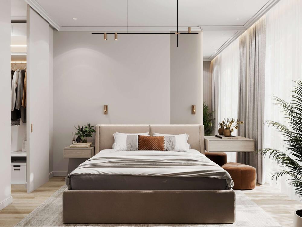 Планировка спальни подчинена симметрии и визуальному покою. Кровать с мягким изголовьем центрирует композицию, по бокам — прикроватные тумбы с лаконичными бра.