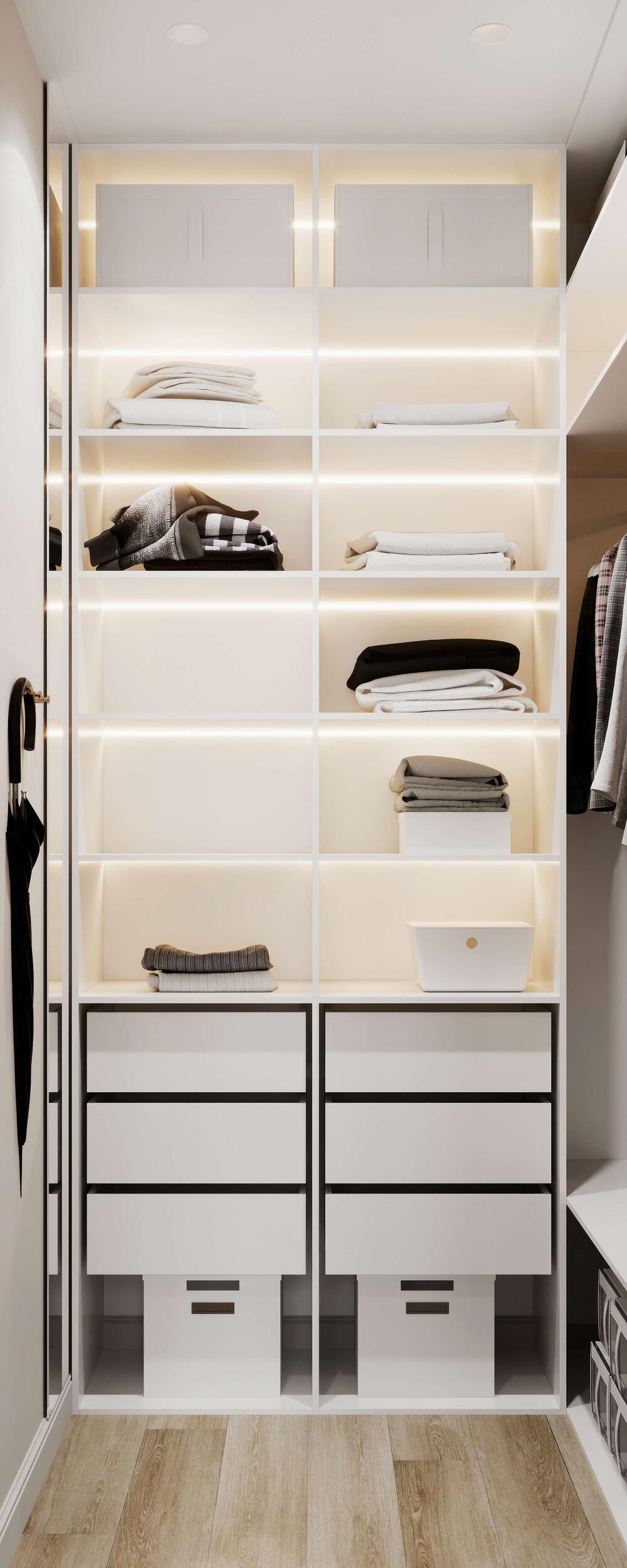 Гардеробная спроектирована как самостоятельное помещение с закрытой системой хранения. Здесь размещены повседневные вещи, обувь и чемоданы — всё компактно и организованно.