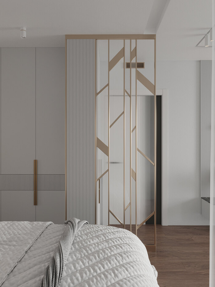 Первоначально квартира включала отдельную лоджию, которая не использовалась как часть жилого пространства. В рамках проекта проведено согласованное объединение балконов с основными комнатами, что позволило увеличить площадь и функциональность. Такое решение дало возможность расширить зону кухни и разместить в эркере уютную зону отдыха. В спальне балкон стал частью гардеробной.