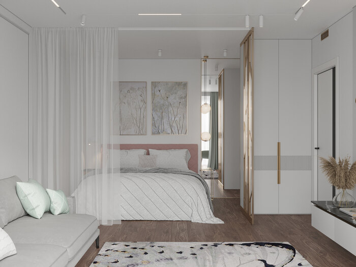 Спальня выделена в отдельную зону внутри гостиной и зонирована лёгкими шторами. Такой приём позволил создать приватное пространство для сна, не нарушая целостность интерьера.