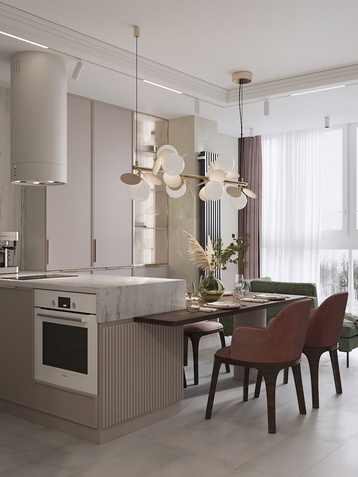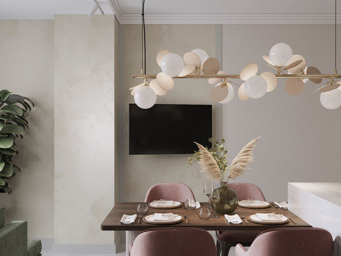 Декор выдержан в пудровой гамме с элементами ар-деко: изящная люстра, продуманное освещение и текстиль с мягкой фактурой. Благодаря нейтральной палитре и минимализму в мебели пространство выглядит просторным и легким.