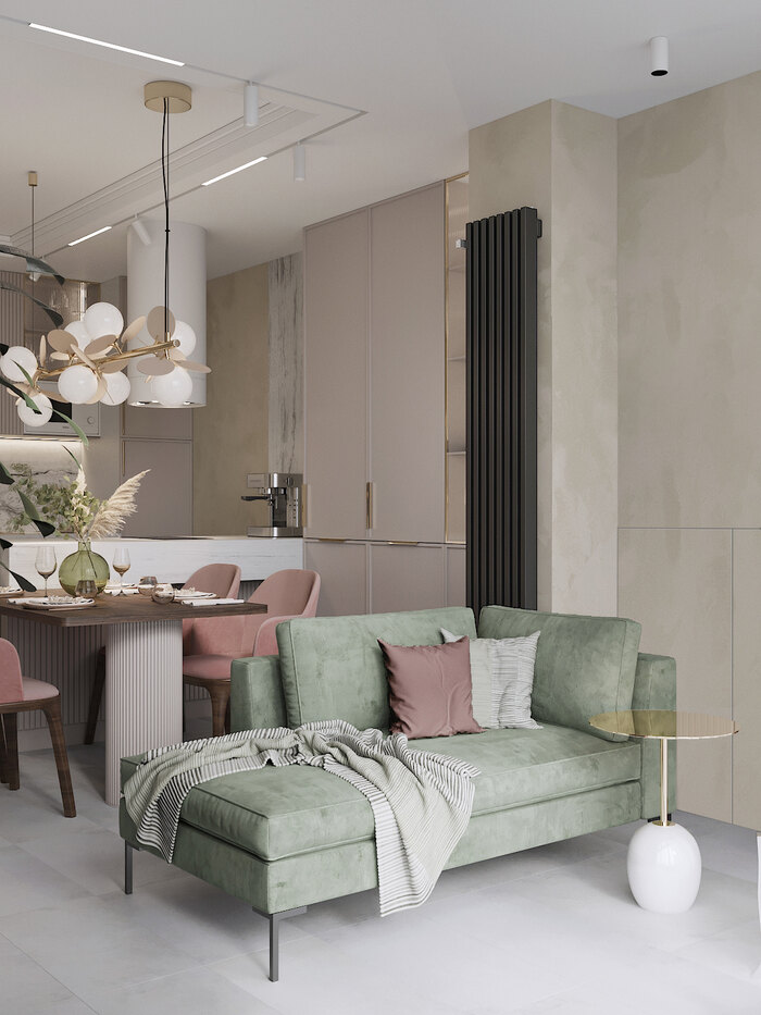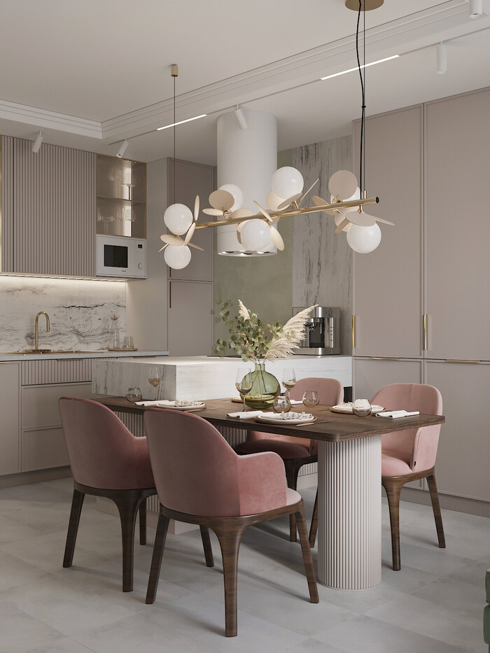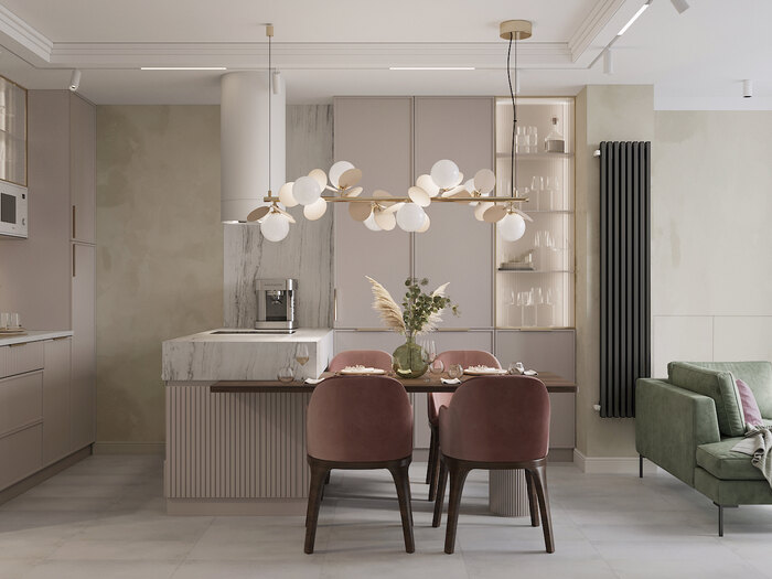 Интерьер получился светлым, с пудровой палитрой и элементами арт-деко. Здесь всё продумано до мелочей, чтобы квартира была красивой и удобной в повседневной жизни.