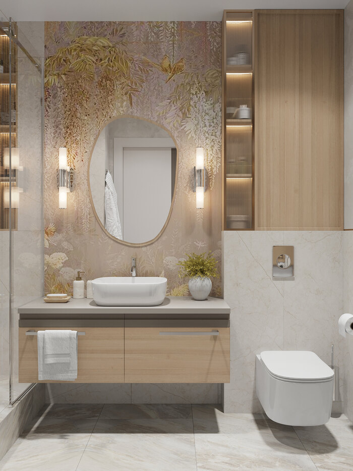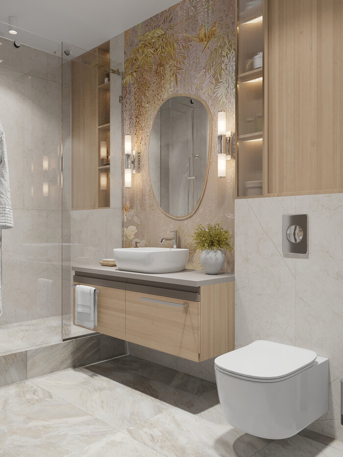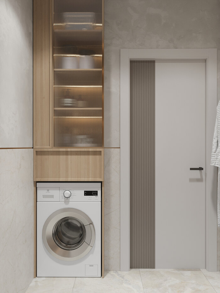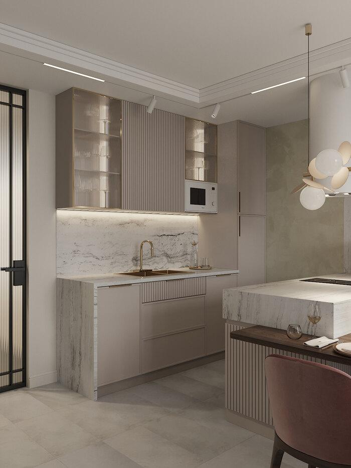Отделка выдержана в пудрово-бежевых тонах с акцентами под натуральный камень. Зона раковины выделена декоративным панно с природным рисунком и встроенной подсветкой, создающей мягкое свечение. Система хранения выполнена в сочетании закрытых фасадов и витрин с рифлёным стеклом.