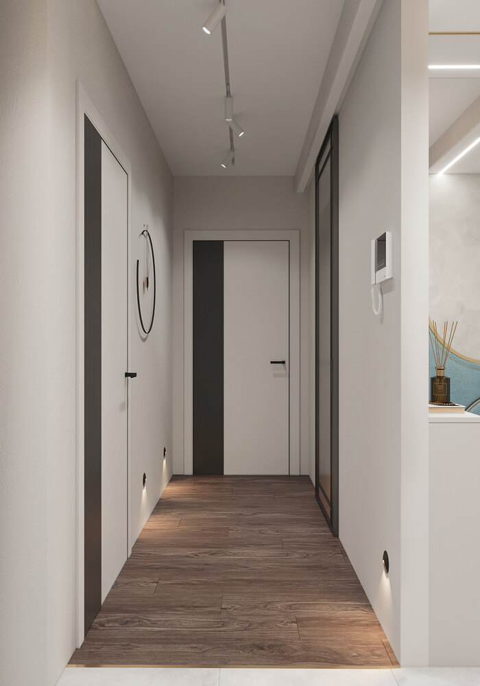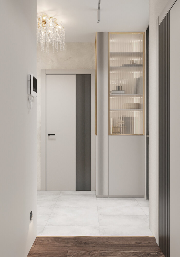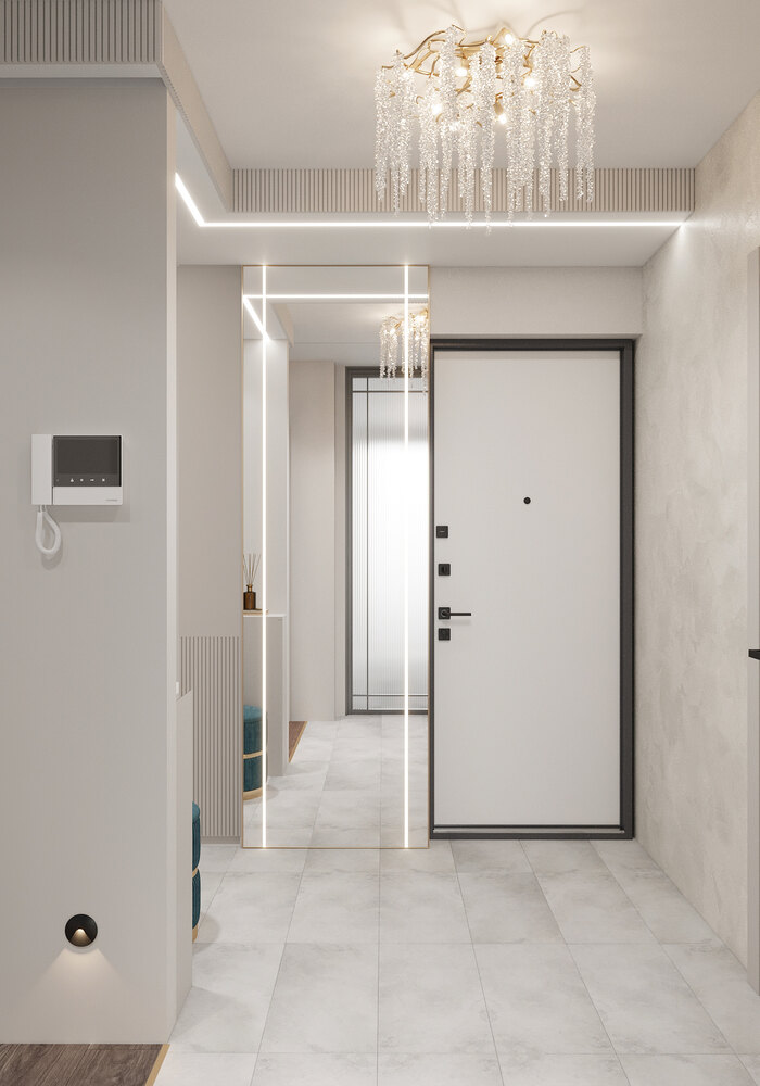 Потолок оформлен с встроенной подсветкой по периметру. В центре — эффектная люстра с хрустальными подвесами. На полу — износостойкая плитка светлого оттенка, которая плавно переходит в тёплое напольное покрытие в коридоре.