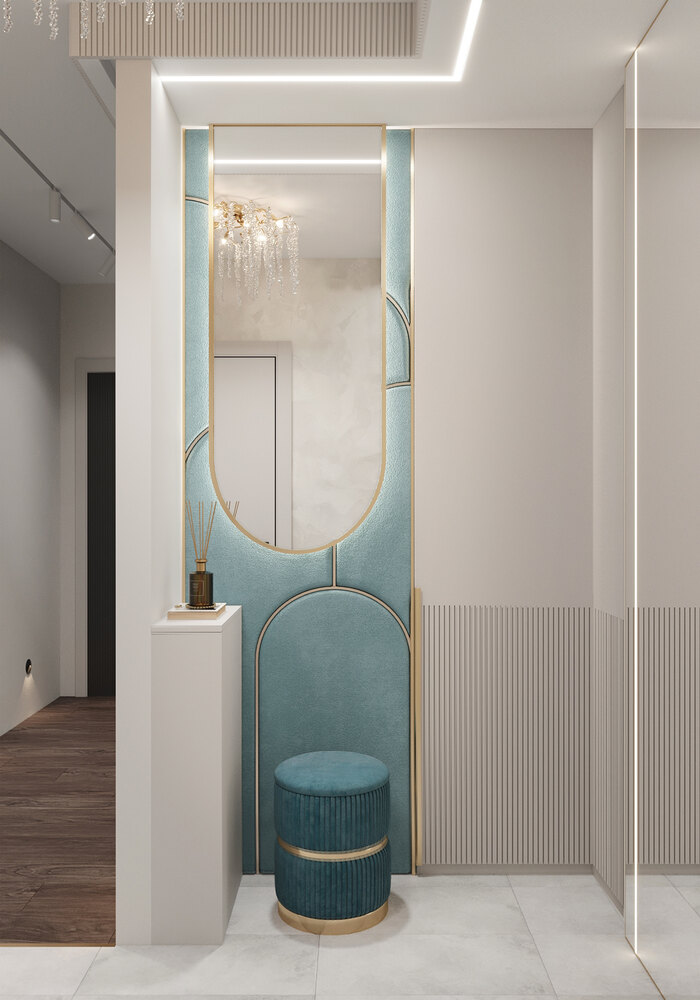 Прихожая встречает светлым и элегантным интерьером. У входа установлен высокий шкаф с зеркалом в полный рост, который визуально расширяет пространство. Рядом — мягкий пуф в бирюзовой обивке и декоративная панель в тон.