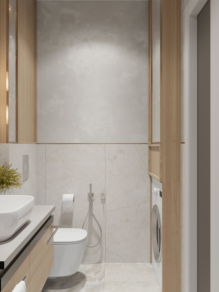 Единственный санузел в квартире спроектирован как совмещённое пространство с душевой. Здесь расположены душевая зона с прозрачной перегородкой, унитаз, раковина с тумбой и встроенная стиральная машина, размещённая в нише напротив унитаза.