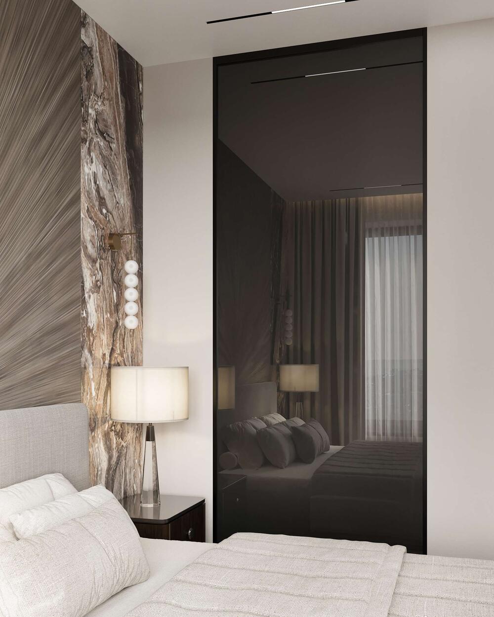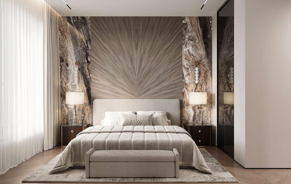 Изюминкой спальни стало декоративное панно за изголовьем кровати, выполненное из натурального мрамора с уникальным рисунком и радиальной текстурой, подчёркнутой встроенной подсветкой.